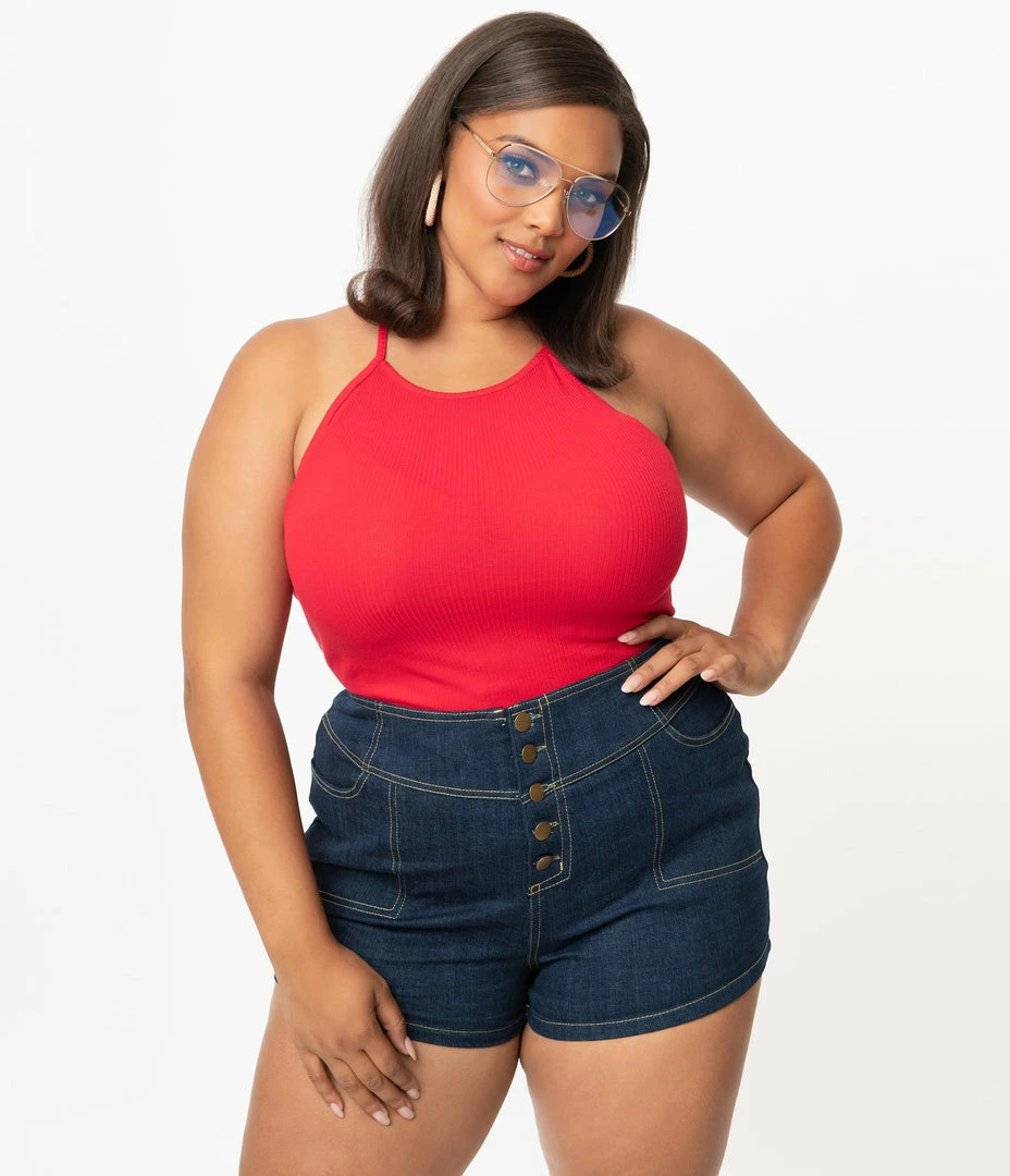 Keep sizzling, gals! Crafted in a marvelous red ribbed cotton knit this plus size tank is secured with spaghetti straps for a lovely halter neckline while the sultry racer back silhouette provides an eye-catching scene!