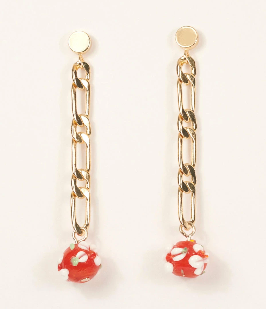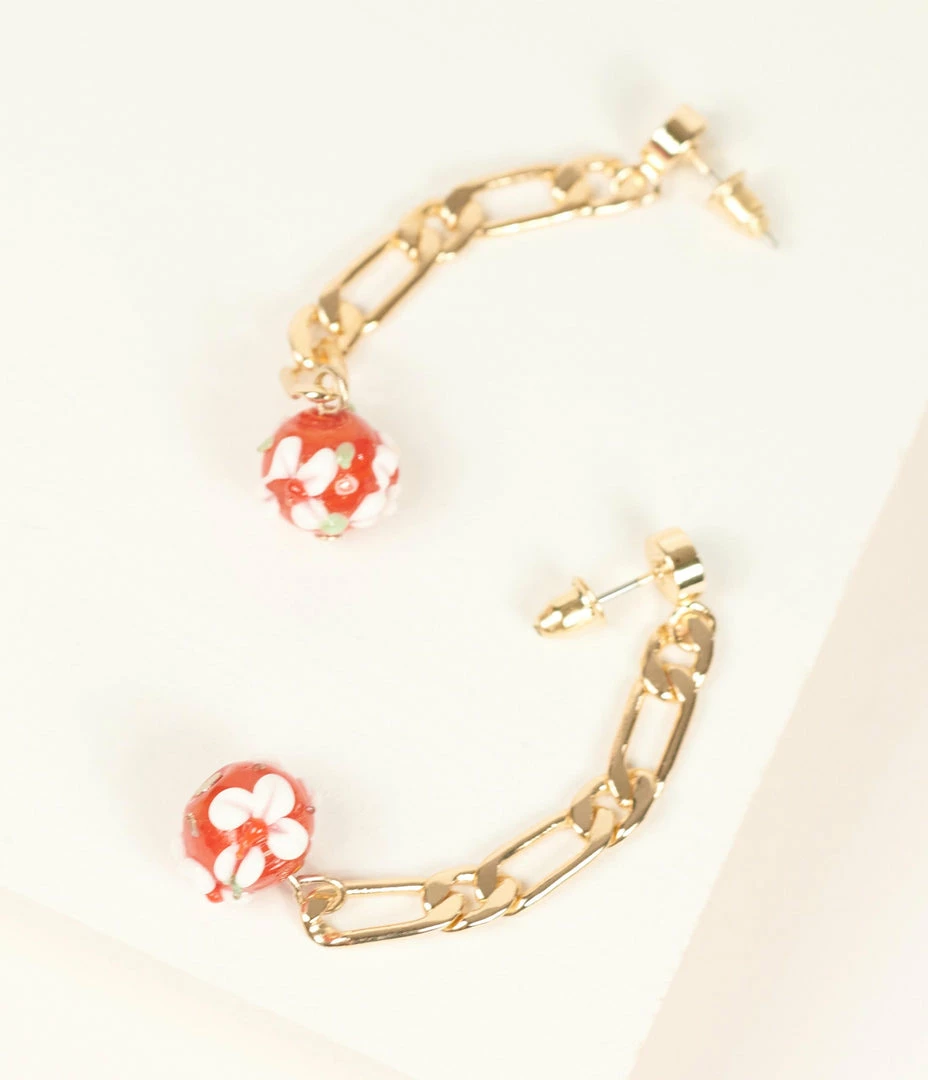 A fabulous set of earrings for your events, a bright red bead features a dainty floral design that dances at the end of a 14K gold plated chain link design. Secure these drop earrings with a post back!
