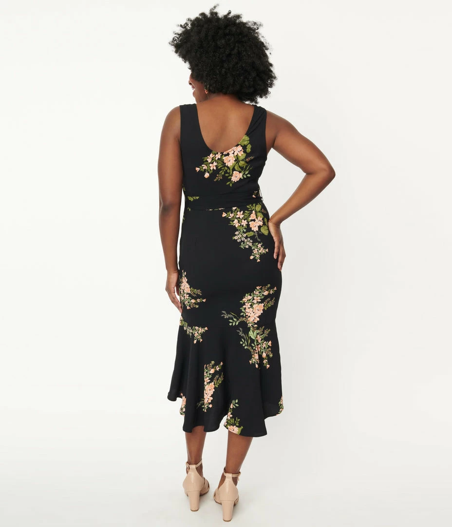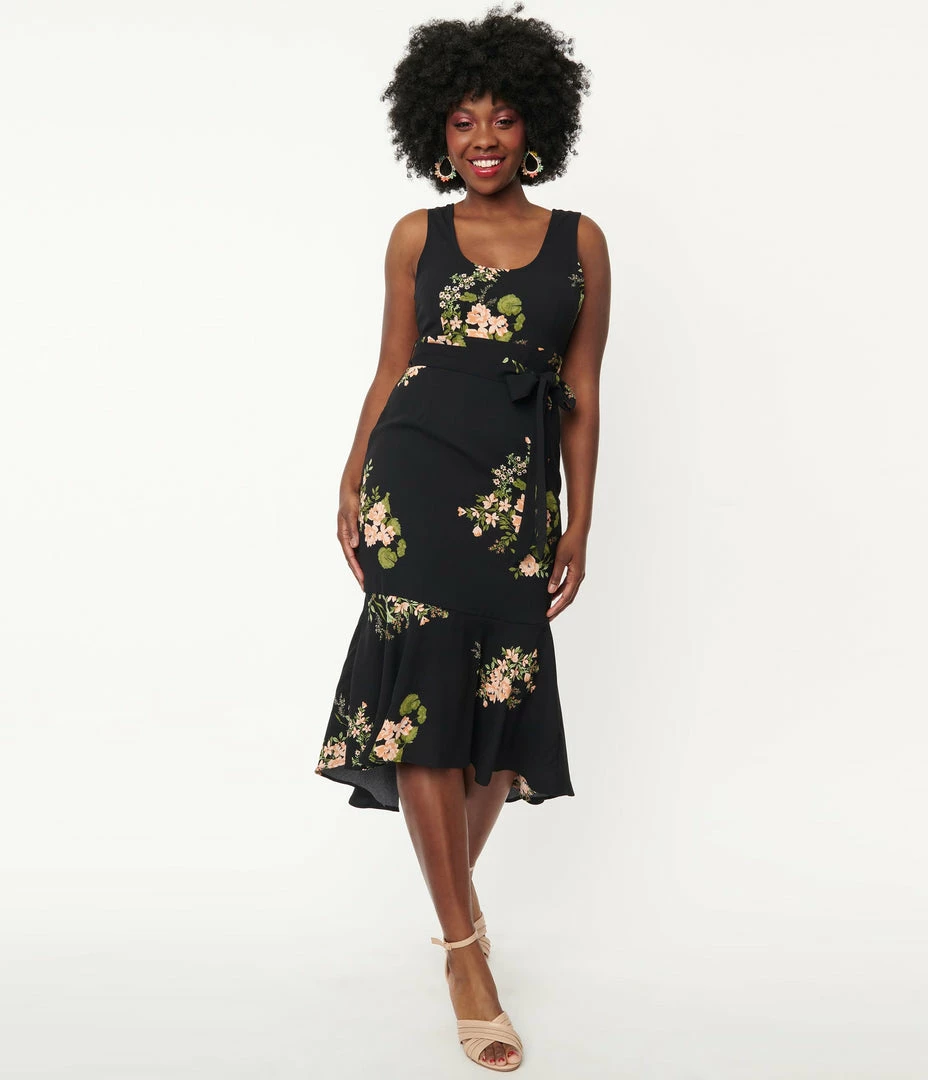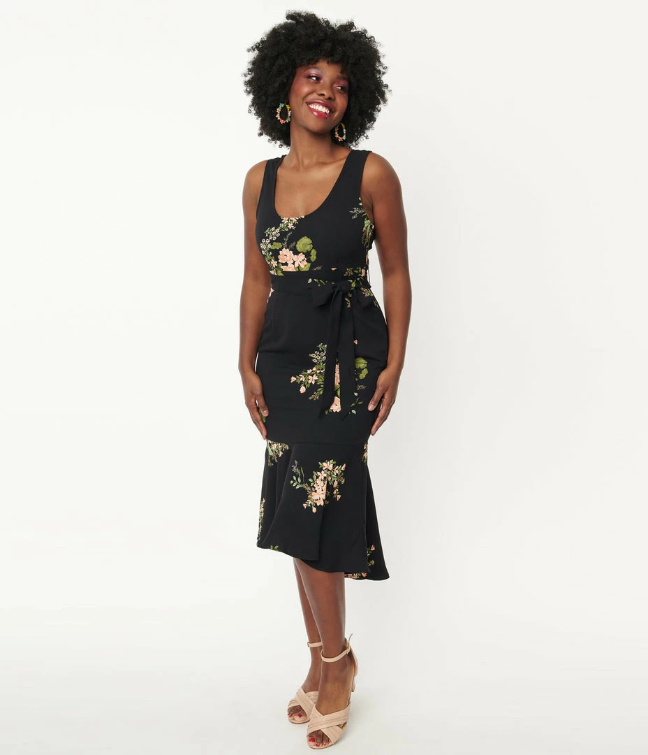 xBring their hearts to their eyes, dames! This fitted pencil dress is crafted a lightweight crepe that dances with pink florals throughout the black backdrop. The sultry scoop neckline and sleeveless design tops a banded waist, cinched with a side zipper and embellished with a matching sash. The curve clutching skirt drops into a trumpet flounce and high-low hem that sways past your knees!