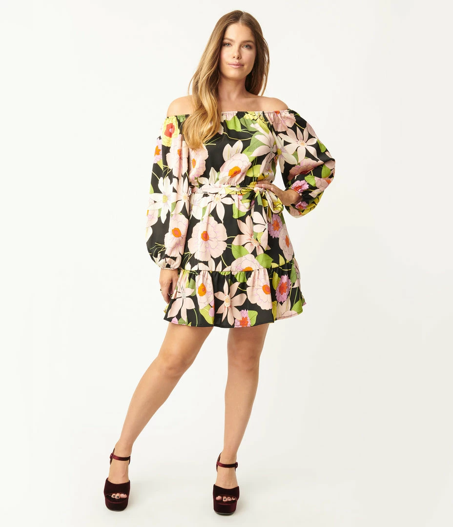 Perfectly dazzling, doll! This charming dress is crafted in a luxurious woven satin fabric boasting light pink florals throughout the black backdrop. The sultry off the shoulder neckline is secured with elastic and framed by the billowing long sleeves with elastic cuffs. The relaxed bodice is cinched by the elastic waistband and self tie sash, while the gathered flare skirt features a bottom flounce ruffle for movement as it dances high above the knees!