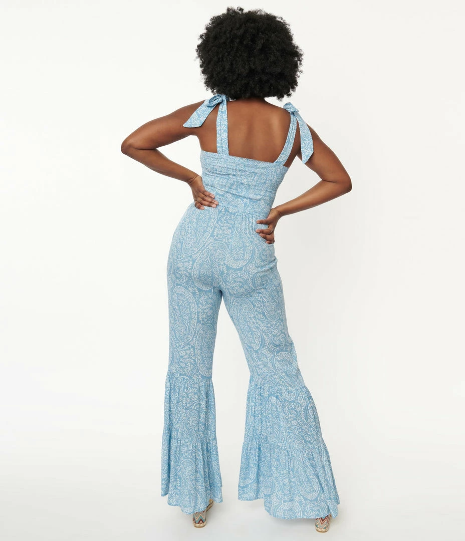 The adoration is overwhelming, dolls! A sweet and retro inspired jumpsuit for a dame with her eyes on good vibes, this darling piece is crafted in a soft and lightweight woven fabric that dances with a white paisley print throughout the blue backdrop. The sultry smocked bodice is secured with self tie shoulder straps while the sweeping flare legs feature a tiered cuff for an added dash of groovy!
