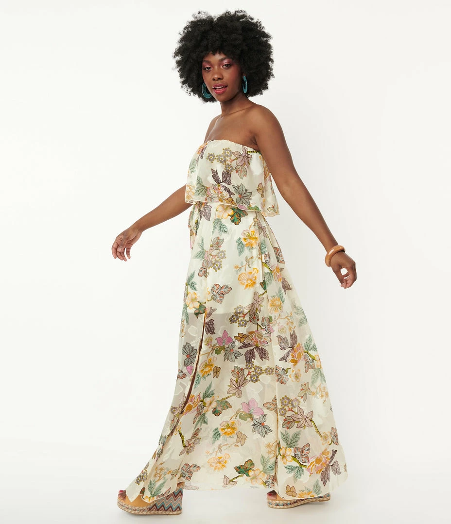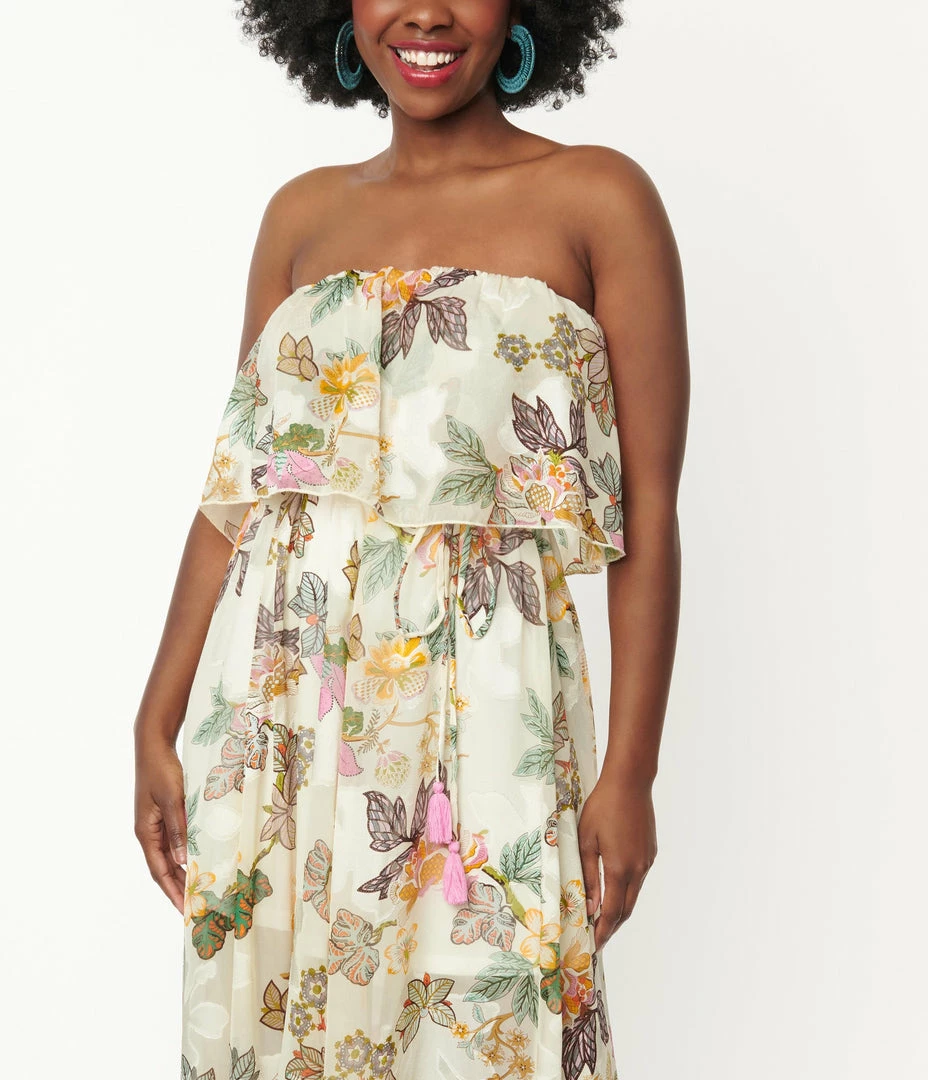 Passionate breezes await, dames! A breathtaking maxi for sweet strolls, crafted in a lightweight fabric that features a champagne floral burnout and a vintage multicolor floral print throughout. The graceful strapless unlined neckline features a gentle draped silhouette while the elastic neckline shows off your shoulders. The elastic waist is embellished with a sweet matching cord that boasts purple tassel ends as the partially lined skirt is designed with a side slit for sultry struts!