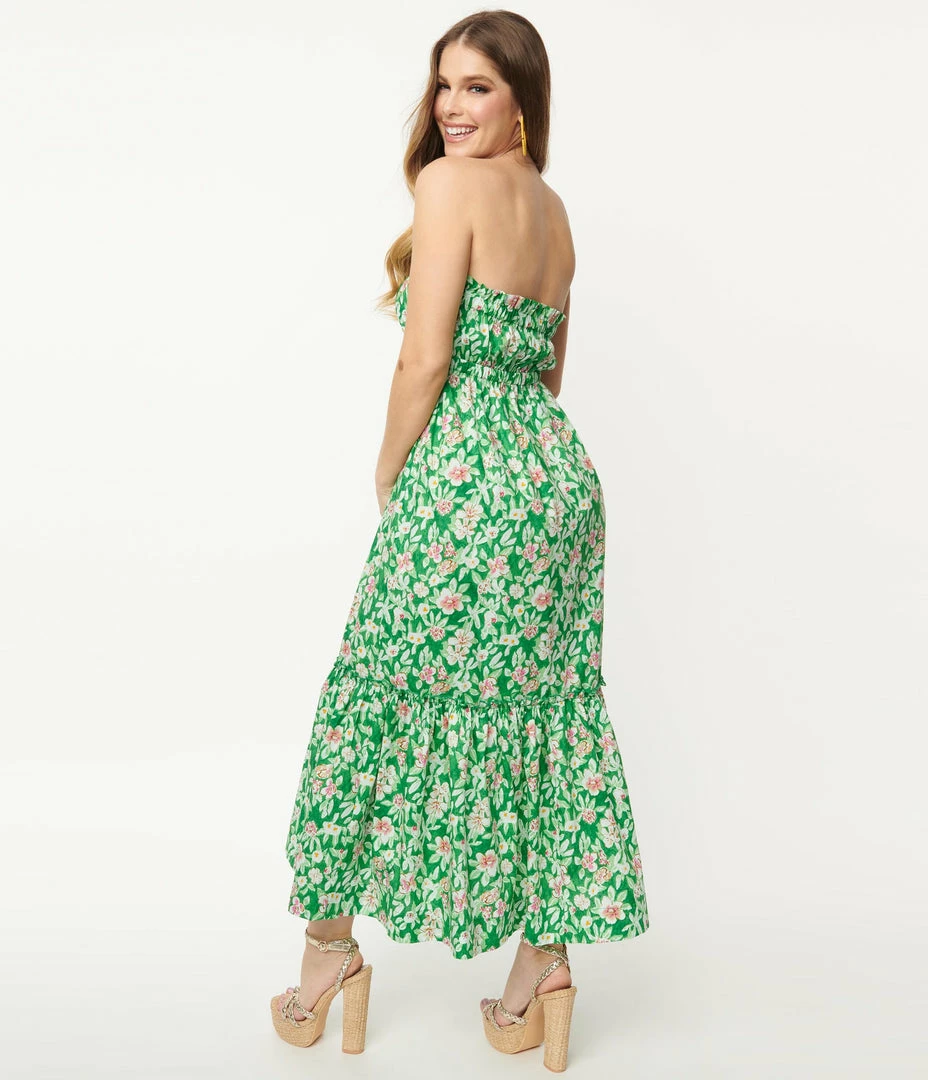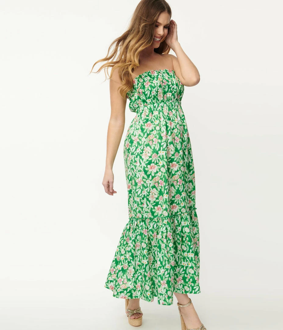 You never doubted spring was on the way, dears! Breeze into the season in a gorgeous maxi dress, crafted in a lightweight woven fabric that dances with white and pink florals throughout a brilliant green backdrop. The strapless top is secured with an elastic neckline while the empire elastic waist nips in your figure. The maxi skirt drops to the floor, complete with a tiered ruffle embellishment for vintage inspiration!