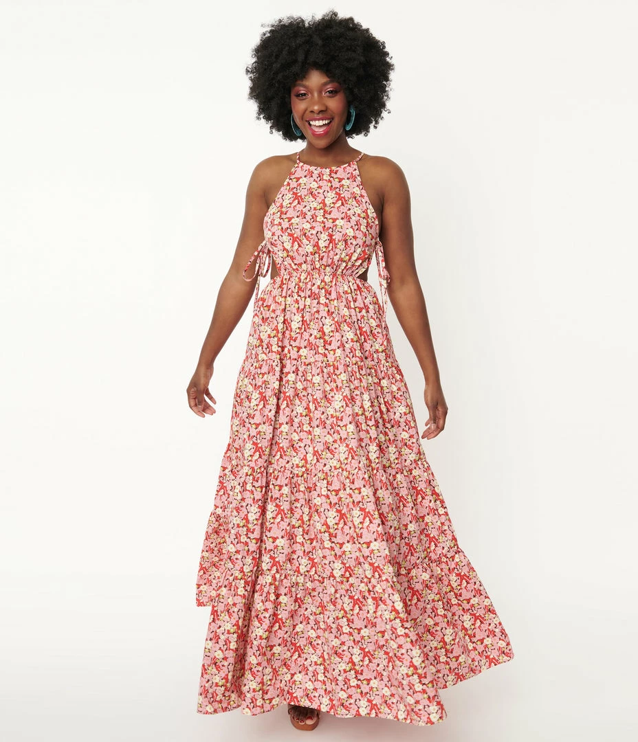 Romantic dreams await, dears! This sweeping maxi dress is crafted in a lightweight cotton and boasts a beautiful floral print in pink and red throughout. The sultry bodice features a high neckline, secured with a back button keyhole and provides a flattering fit with side self ties. The elastic waist nips in your figure as the tiered maxi skirt cascades to the floor!