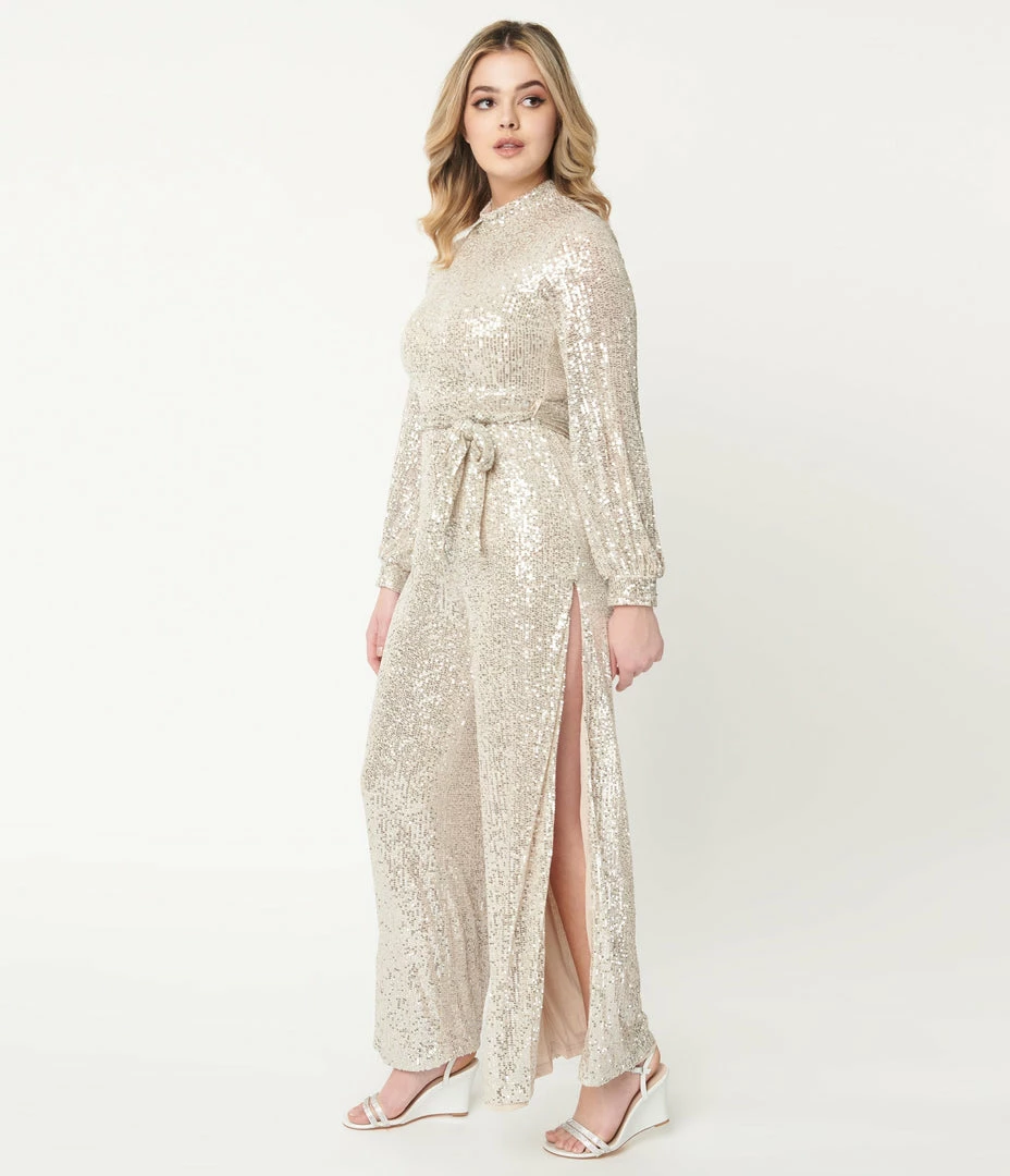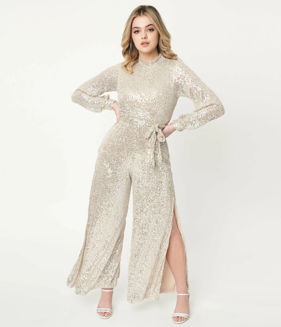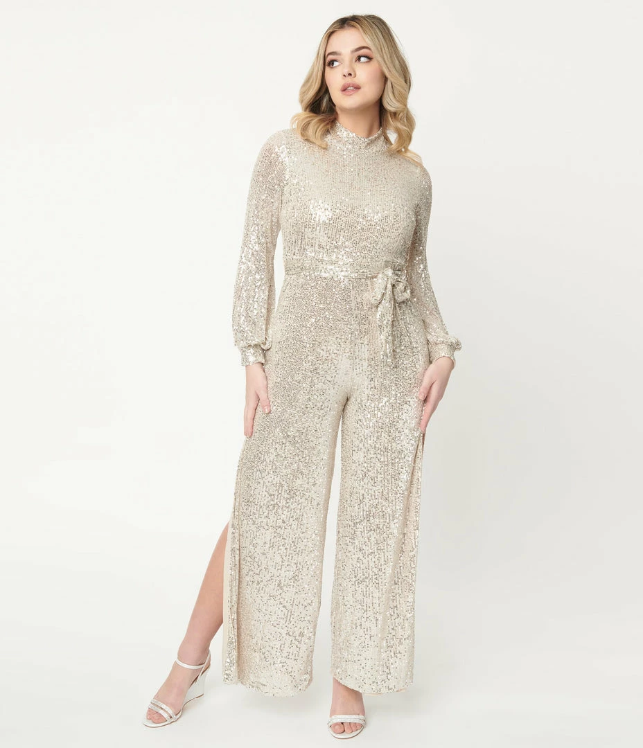 Sparkle with confidence, dames! A radiant jumpsuit for a retro cocktail, this stunning piece features silver sequins throughout the light beige knit lining. The darted bodice boasts modest mock turtleneck, framed by long sleeves that drop into a banded cuff. The elastic seamed waist is cinched with a matching sash and back zipper while the wide pant legs drop into a sexy side slit opening that swirls around your form as you shimmer into the new year!
