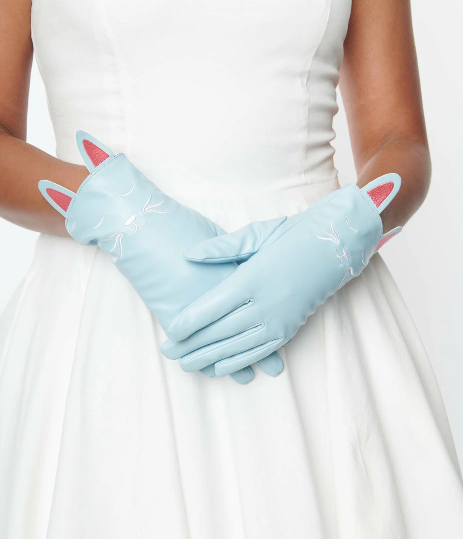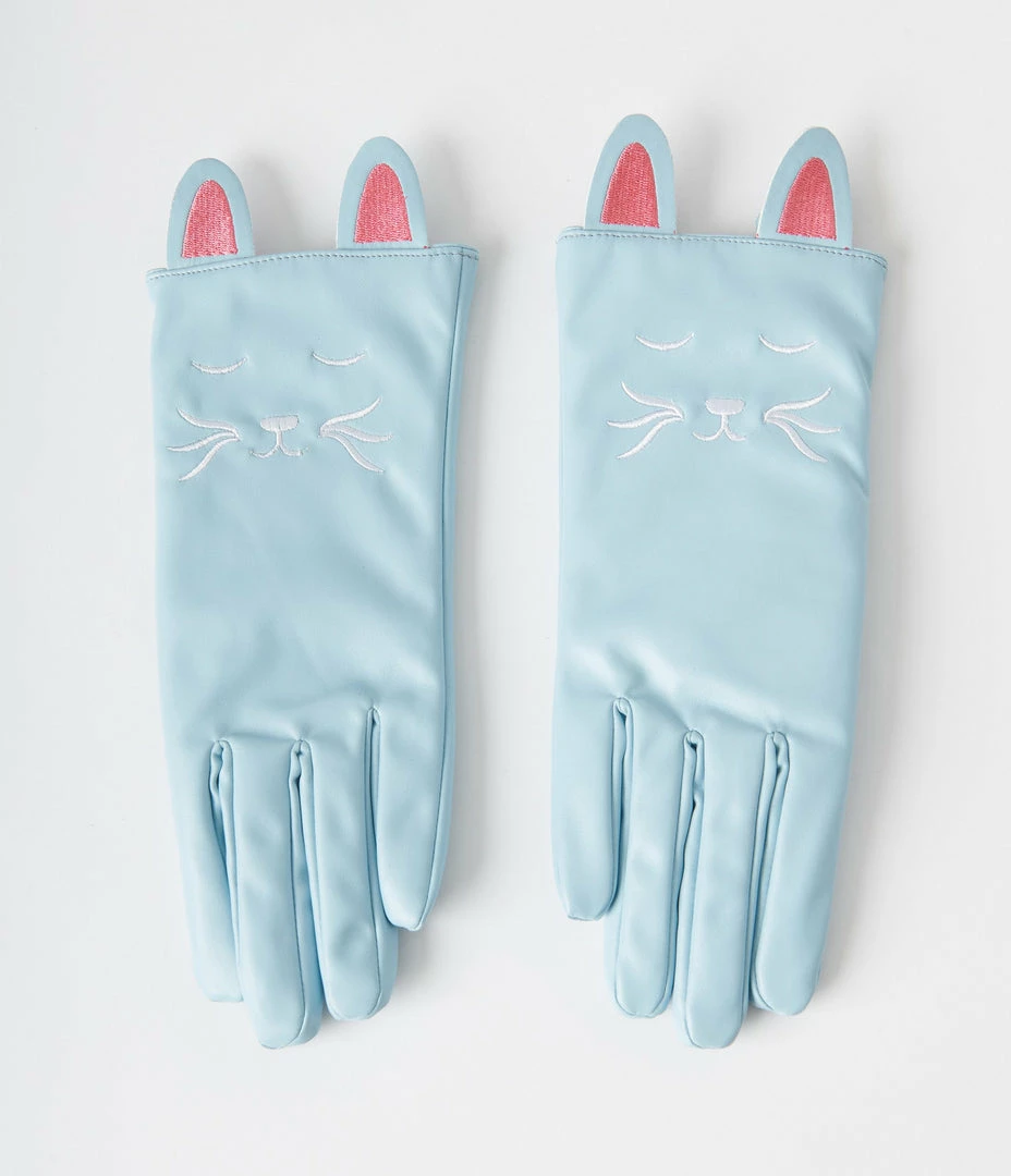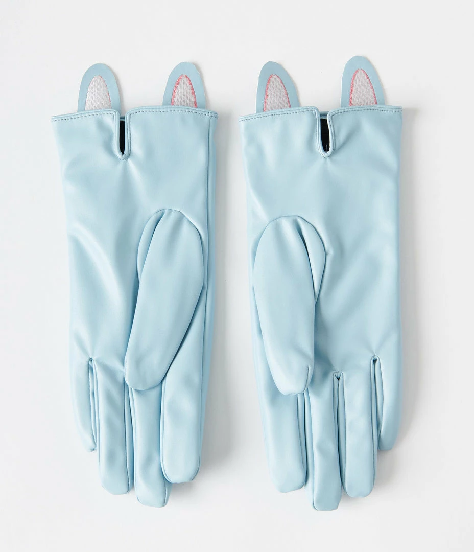 These delightful wrist gloves from Collectif are crafted in light blue leatherette and feature white embroidered accents of a sweet bunny!