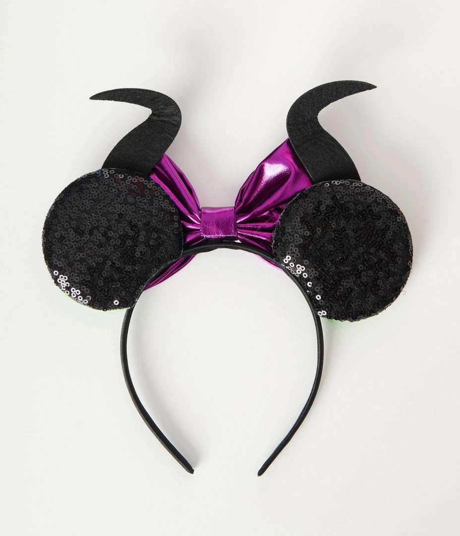 This devilish headband features plush mouse ears decked out in black sequins and highlighted with green and purple glitter flames, centered by a purple metallic fabric bow and topped by black flat back dragon horns.