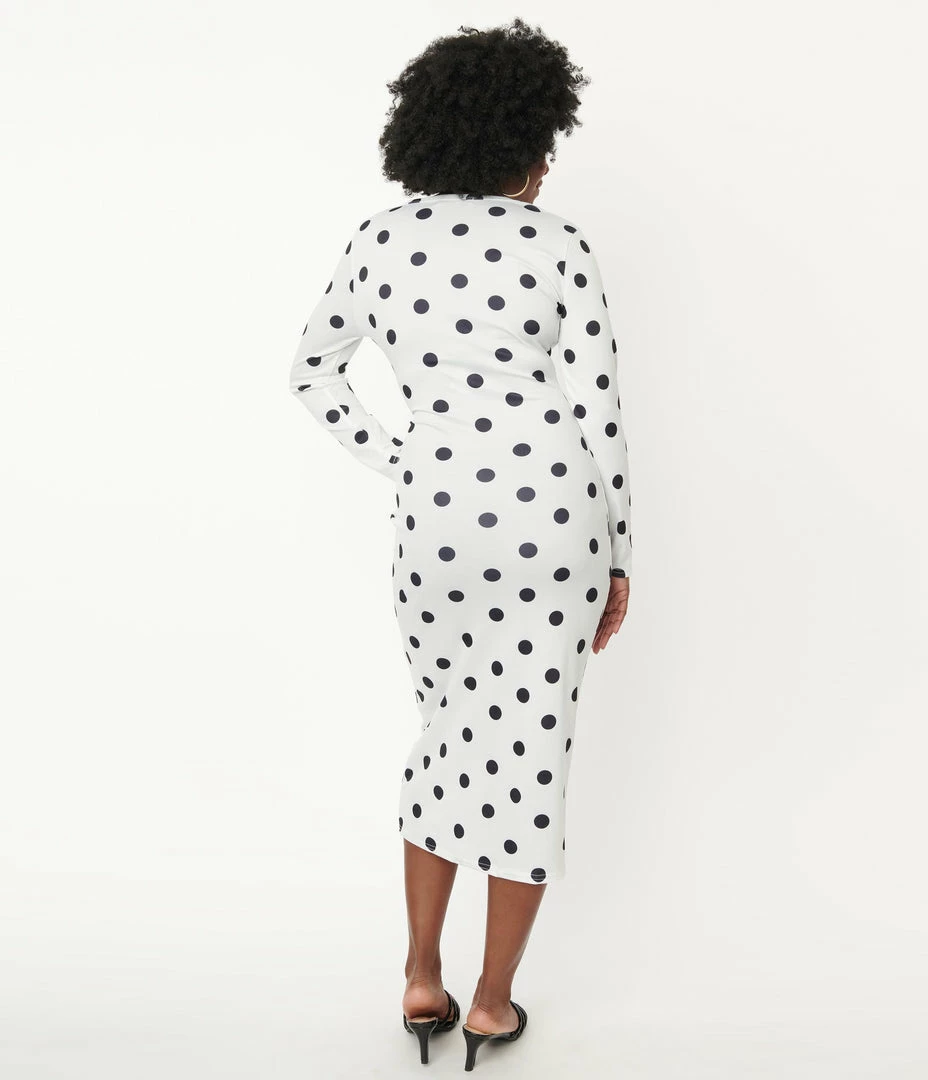Make them look twice, doll! This gorgeous midi dress dances with black polka dots throughout the bright white backdrop. Crafted in a sturdy stretch knit for a flattering fit and hugs your curves in all the right ways, while the sultry V-neckline is framed by slender long sleeves, and the midi pencil skirt stops below the knees!