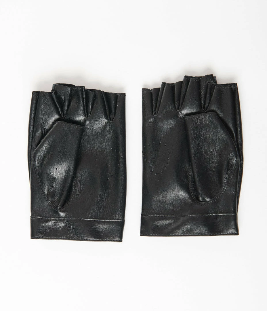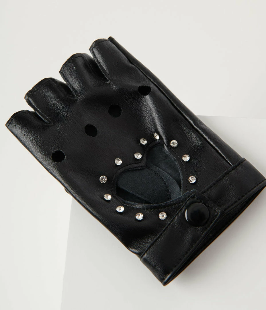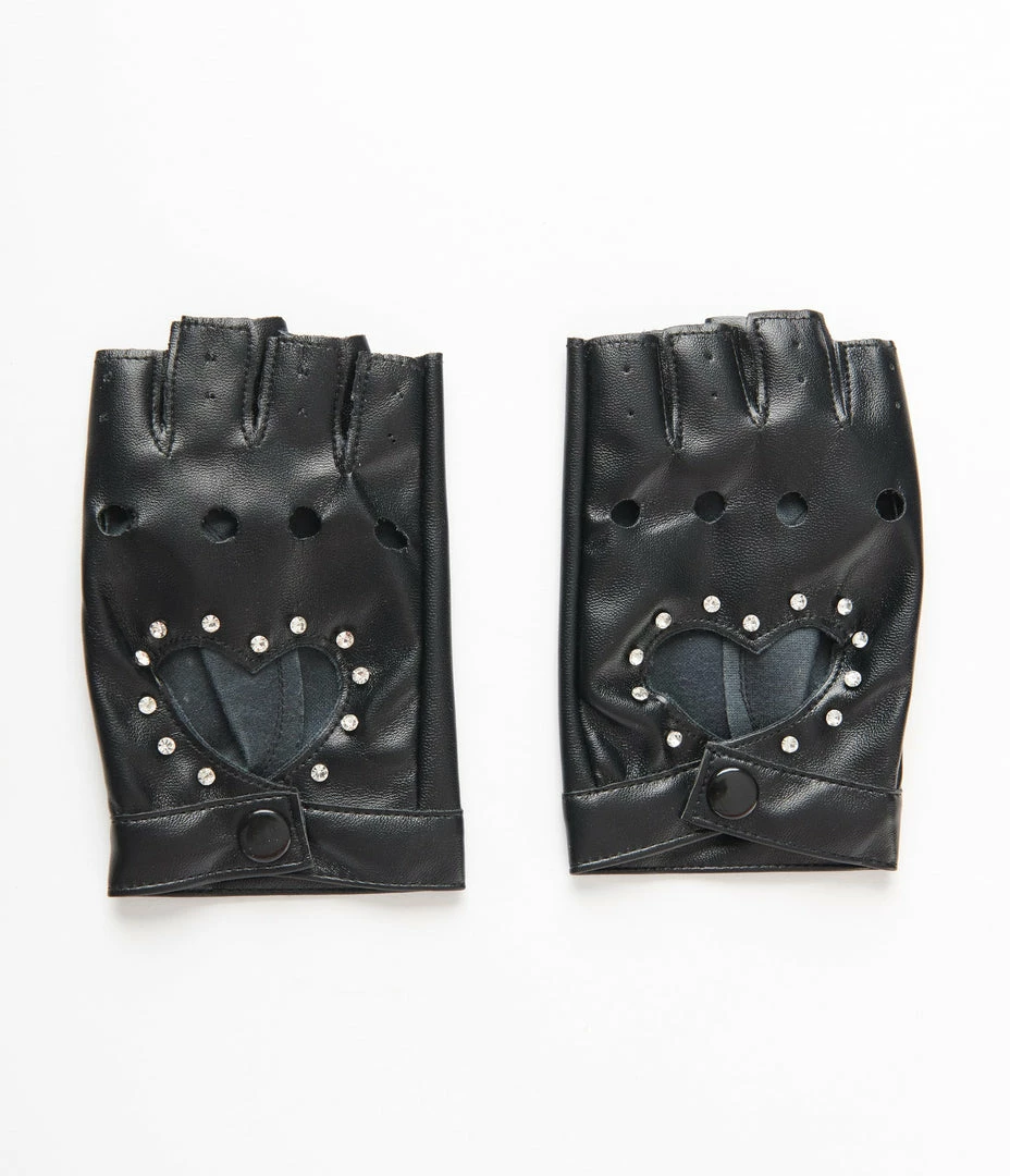 Feel like a boss with these fingerless gloves! Crafted in a black faux leather fabric, these gloves sport a heart cutout design decorated with rhinestones.
