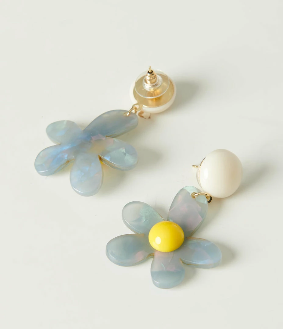 These sweet earrings are crafted in a translucent marble blue acrylic cast in adorable daisies, secured with post backs.