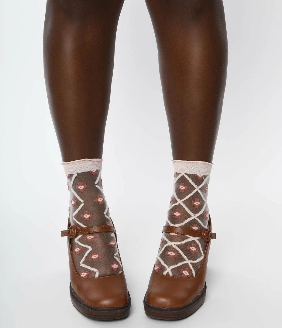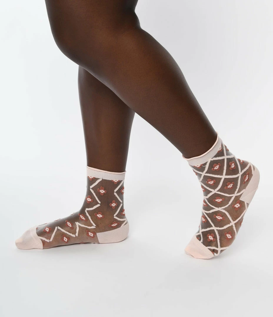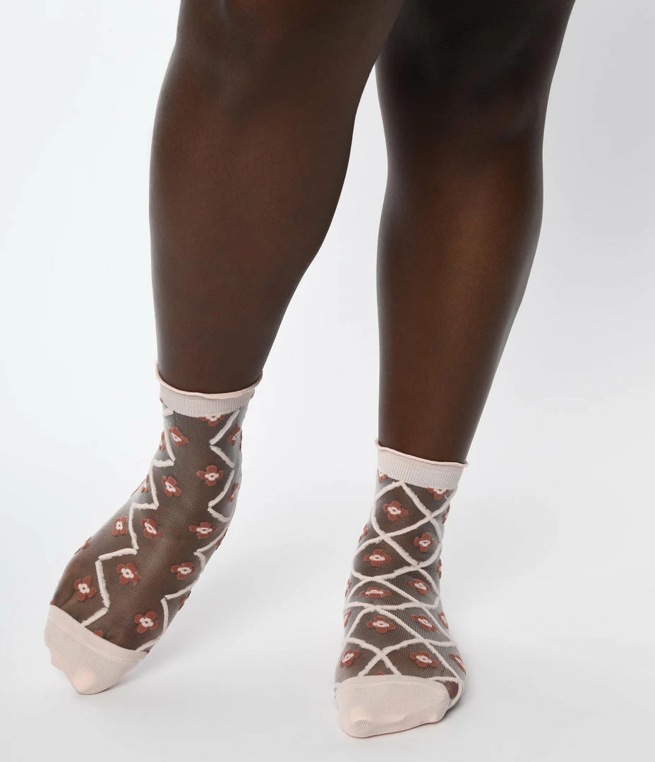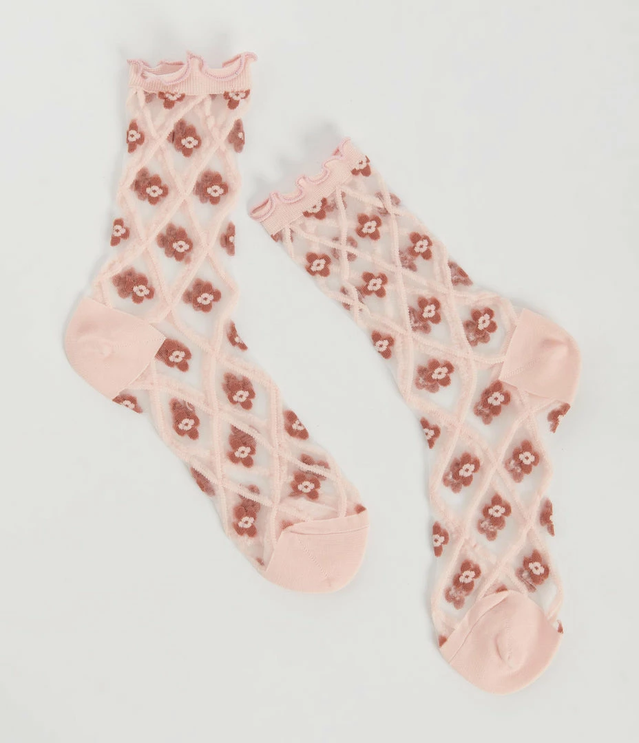 These adorable sheer crew socks feature mauve daisies encapsulated in blush diamonds. Completely with a blush pink frill cuff and heel.