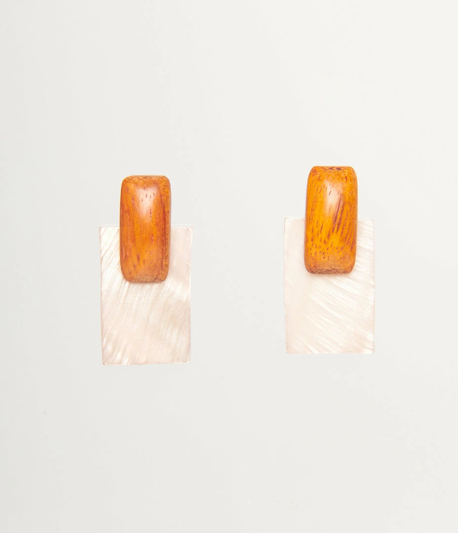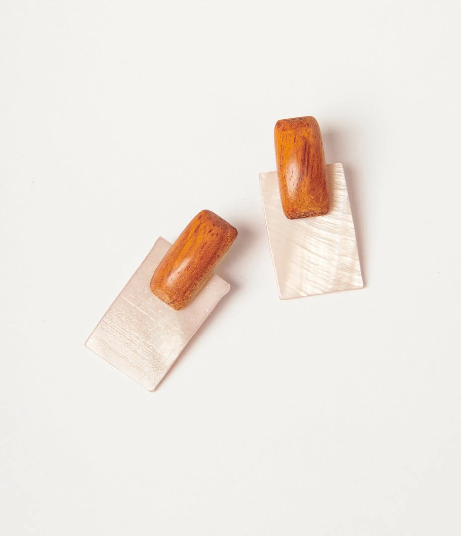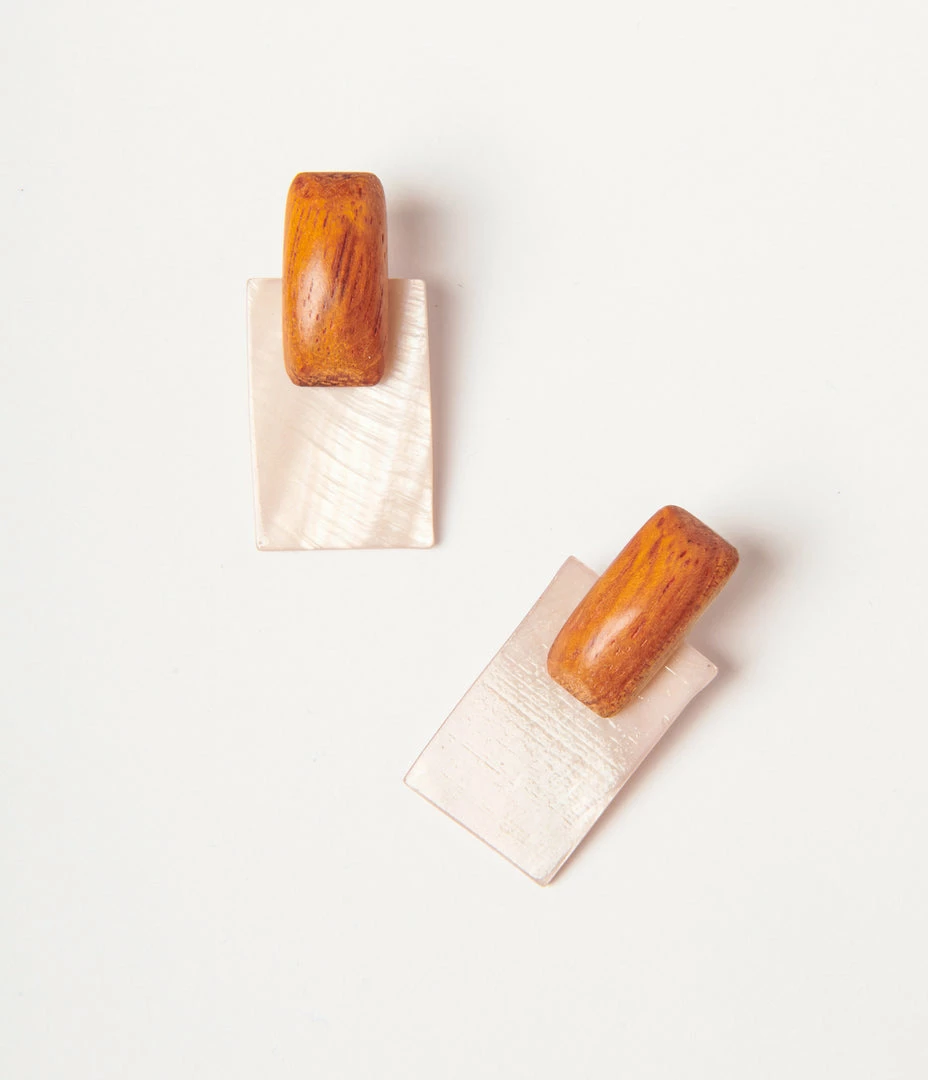 A chic set of earrings, featuring a beige marble acetate rectangle, topped by a wood-style rectangle and secured with post back.