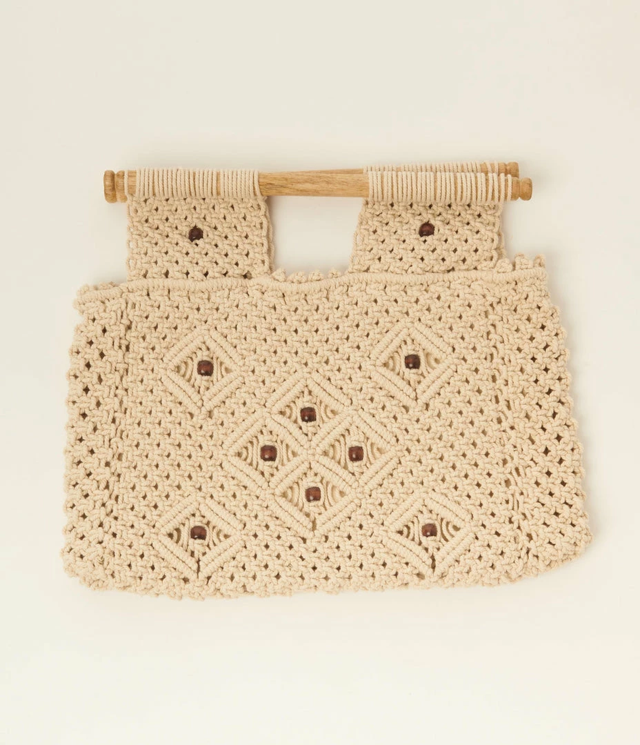 Vintage style was never this easy! This retro inspired handbag in a beige knit design complete with sweet beaded accents set in knitted diamond patterns. The dual wooden handles open to a fabric interior with an inner slip pocket to keep your items secure!