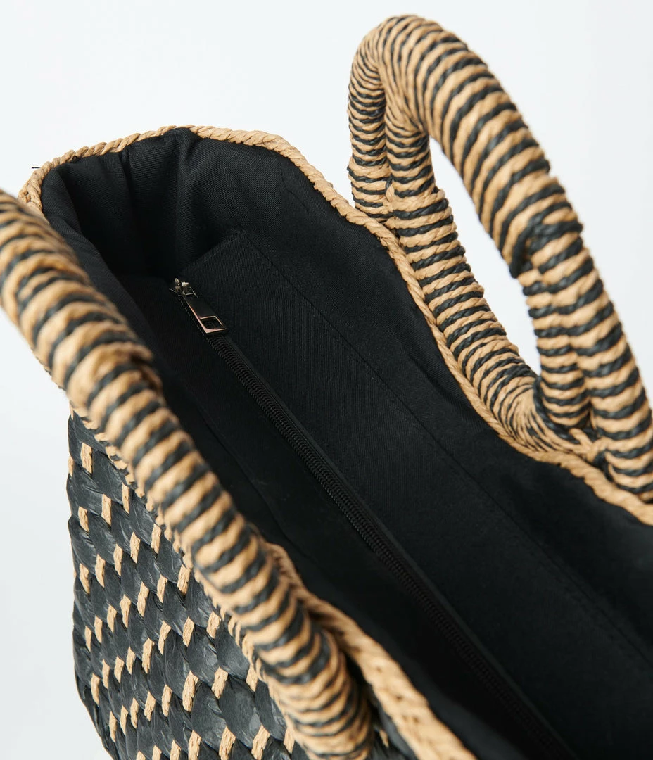 A chic and breezy tote crafted in black and tan woven straw-like textile. Outfitted with dual top handles and a fabric interior, secured with a top zipper and complete with an inner slip pocket.
