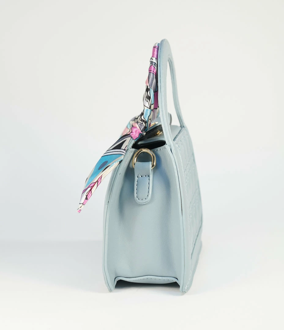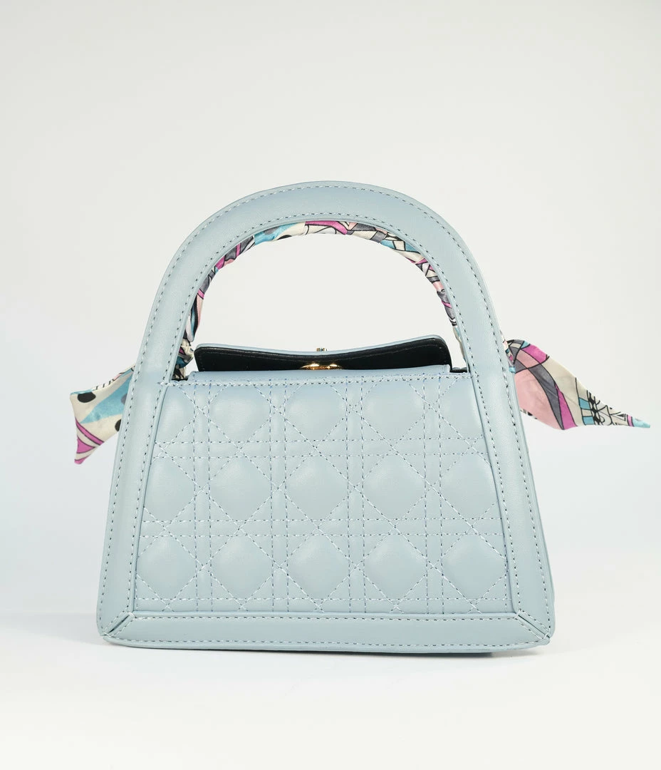 This darling vintage inspired purse is crafted in a light blue leatherette and boasts a fun quilted pattern. The dual tops handles are accented with wrapped scarf detailing on one handle, while the removable chain shoulder strap lends versatile wear. The twist lock closure opens to a black fabric inner complete with inner slip pocket to keep your items organized!