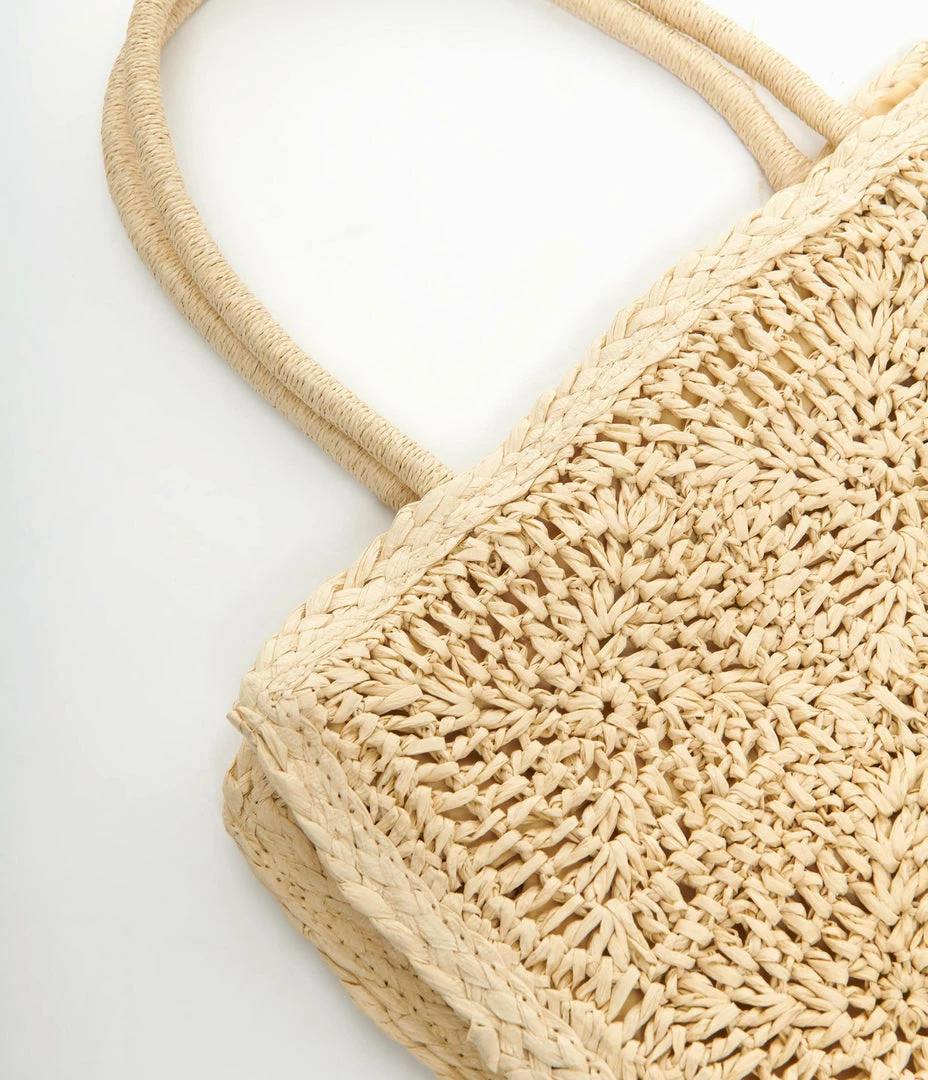 A darling tote bag, featuring beige straw-like textile, braided in a charming design and boasting a fabric interior. Outfitted with dual top handles, a top zipper, and an inner slip pocket.