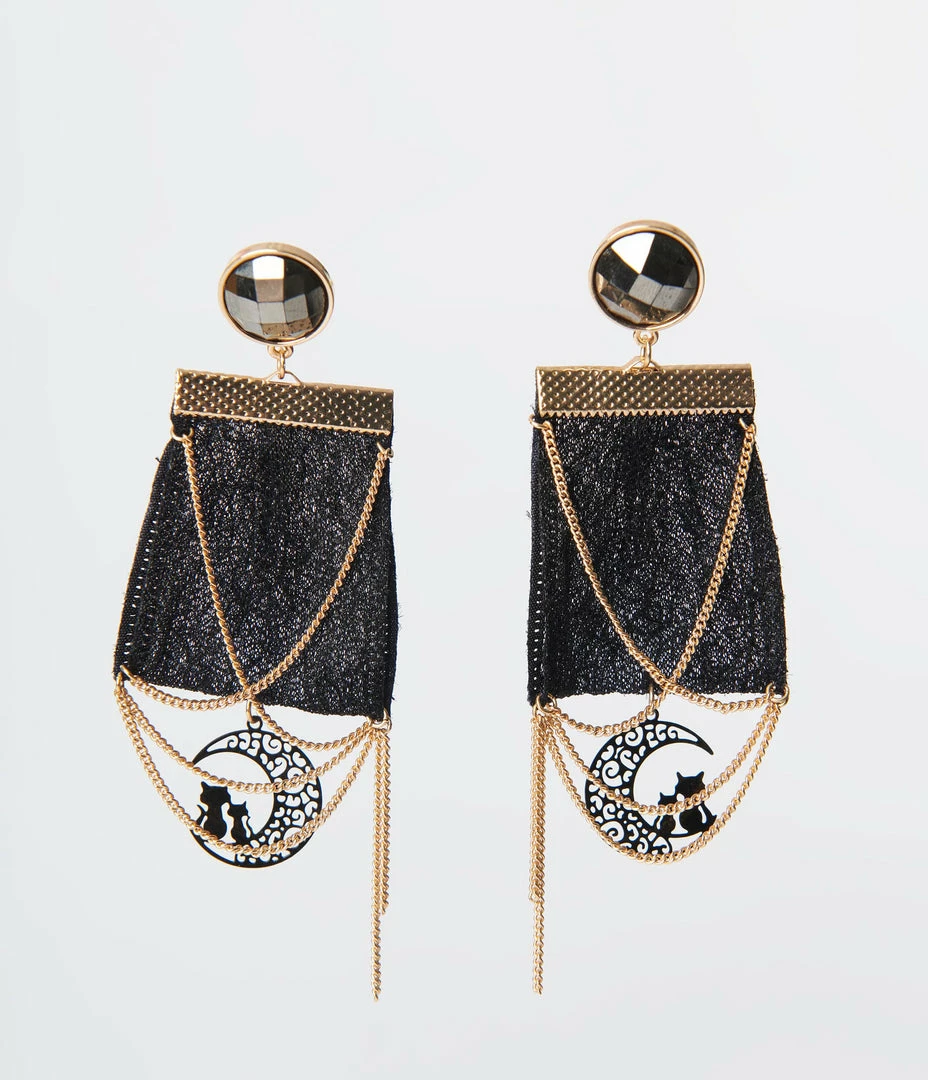 These charming earrings are crafted in a sparkling black fabric set in golden hardware, complete with a dangling crescent moon with two cats sitting on it. Secured with post backs!