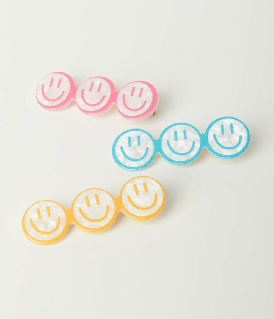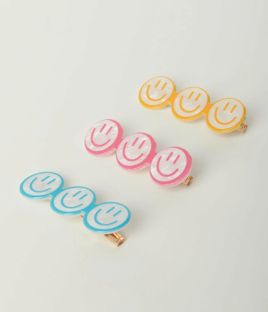 Bring a groovy addition to your visage with these sweet happy face hair clips, boasting pink, blue, and yellow smiley faces in white marble acrylic. Secured with alligator clip backs.