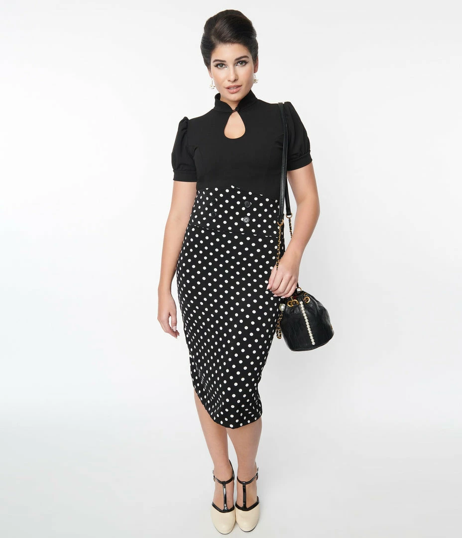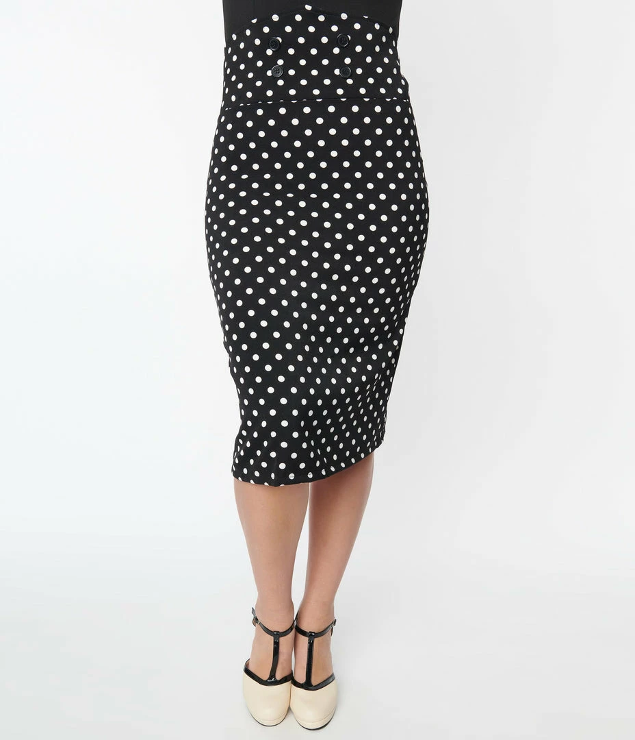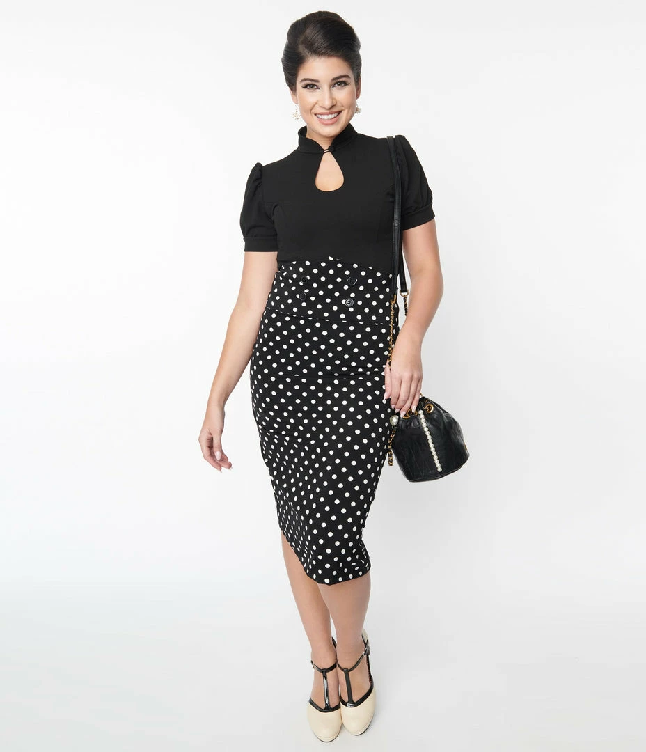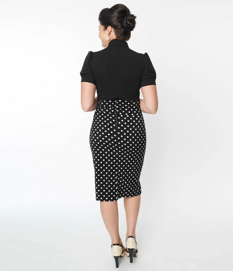 This lovely separate is crafted in a black woven stretch blend, dancing with white polka dots throughout and boasting a fabulous wiggle silhouette. The banded waist nips you in as the stretch fabric flatters your curves, while the back slit adds a sultry touch. Complete with a back zipper!