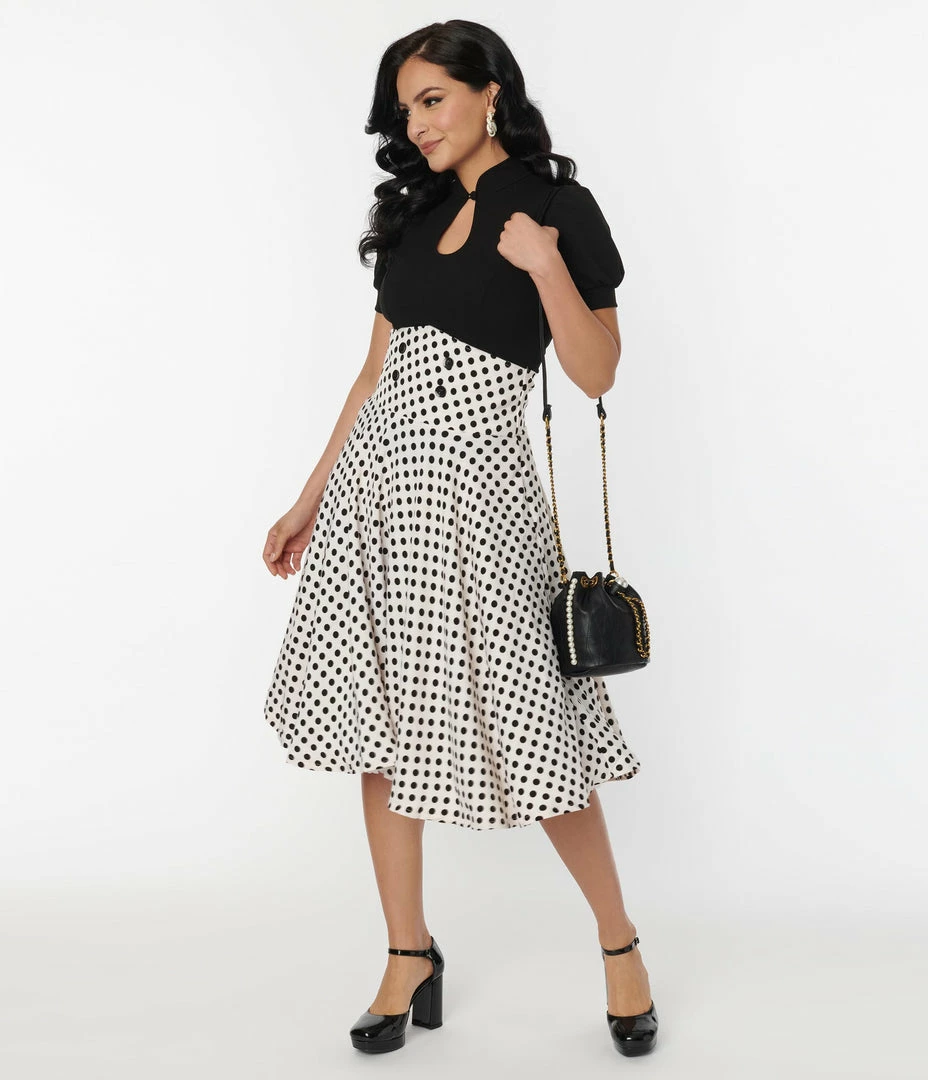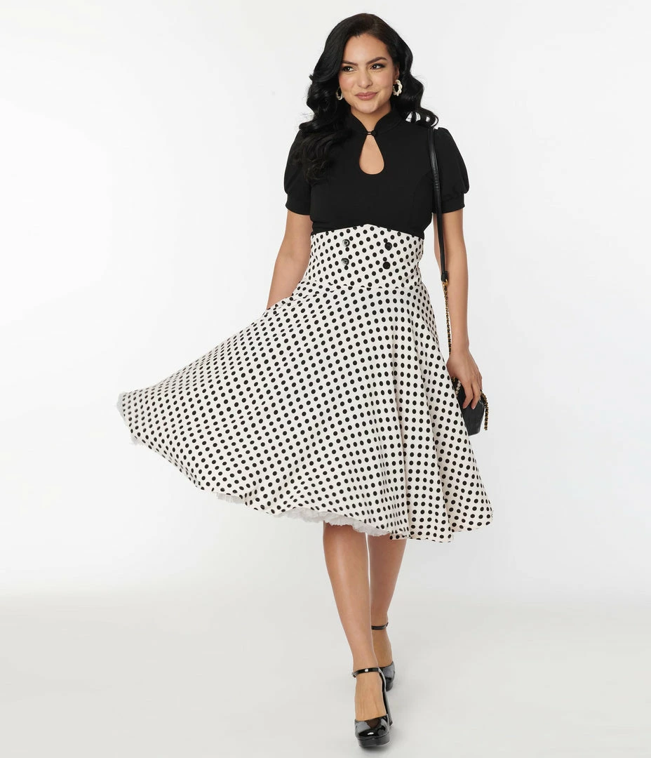This charming swing skirt is crafted in a white and black polka dot woven fabric and boasts a high waist silhouette accented with faux buttons