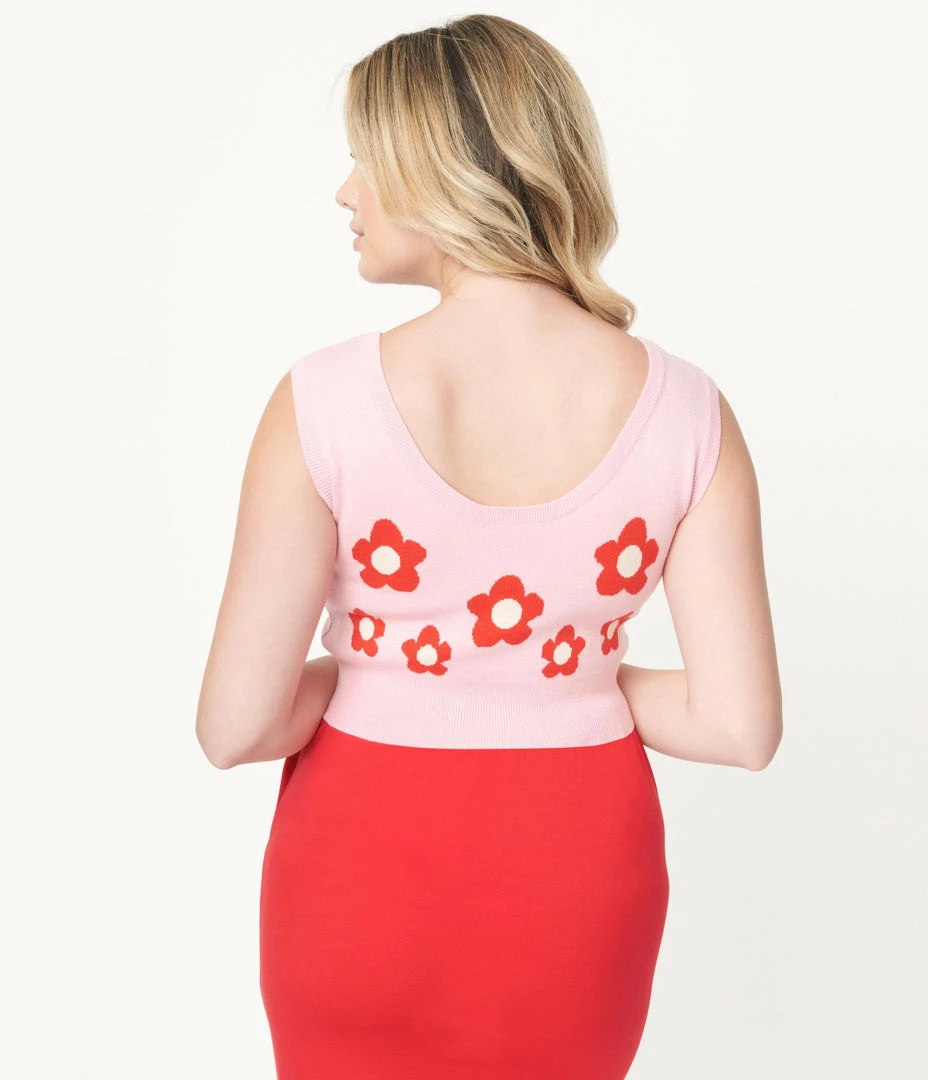 Count your romances, dolls! This sweet crop top is crafted in a thick stretch knit blend that flatters your feminine figure in a light strawberry pink that dances with red and ivory daisies throughout. The sultry scoop neckline and sleeveless silhouette is ready for heated affairs while the cropped design boasts a stay in place hem for a flattering fit!
