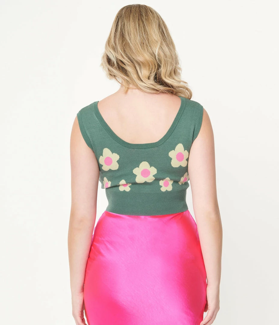 Count your romances, dolls! This sweet crop top is crafted in a thick stretch knit blend that flatters your feminine figure in a teal green that dances with mint and pink daisies throughout. The sultry scoop neckline and sleeveless silhouette is ready for heated affairs while the cropped design boasts a stay in place hem for a flattering fit!