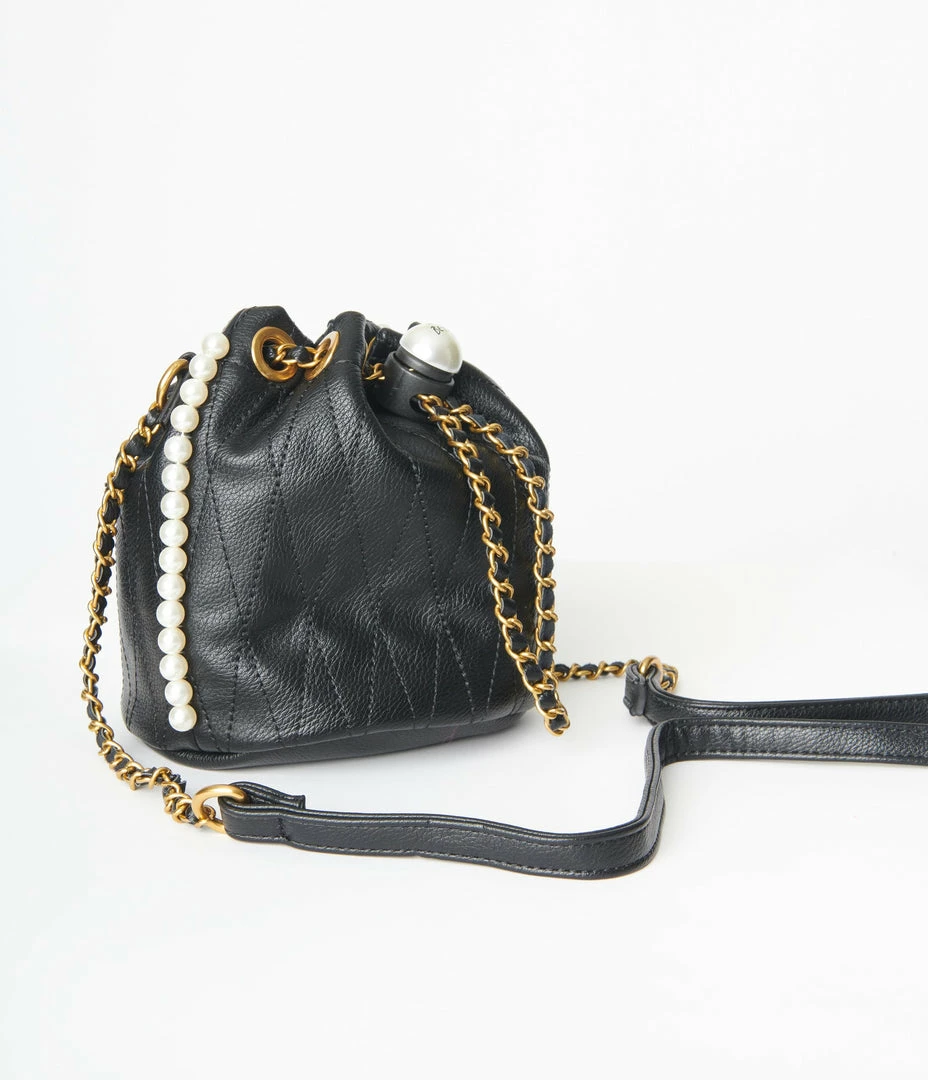 This gorgeous bucket bag from Betsey Johnson is crafted in black leatherette, and boasts a gold chain drawstring closure, pink fabric interior, faux pearl accents, and shoulder strap!