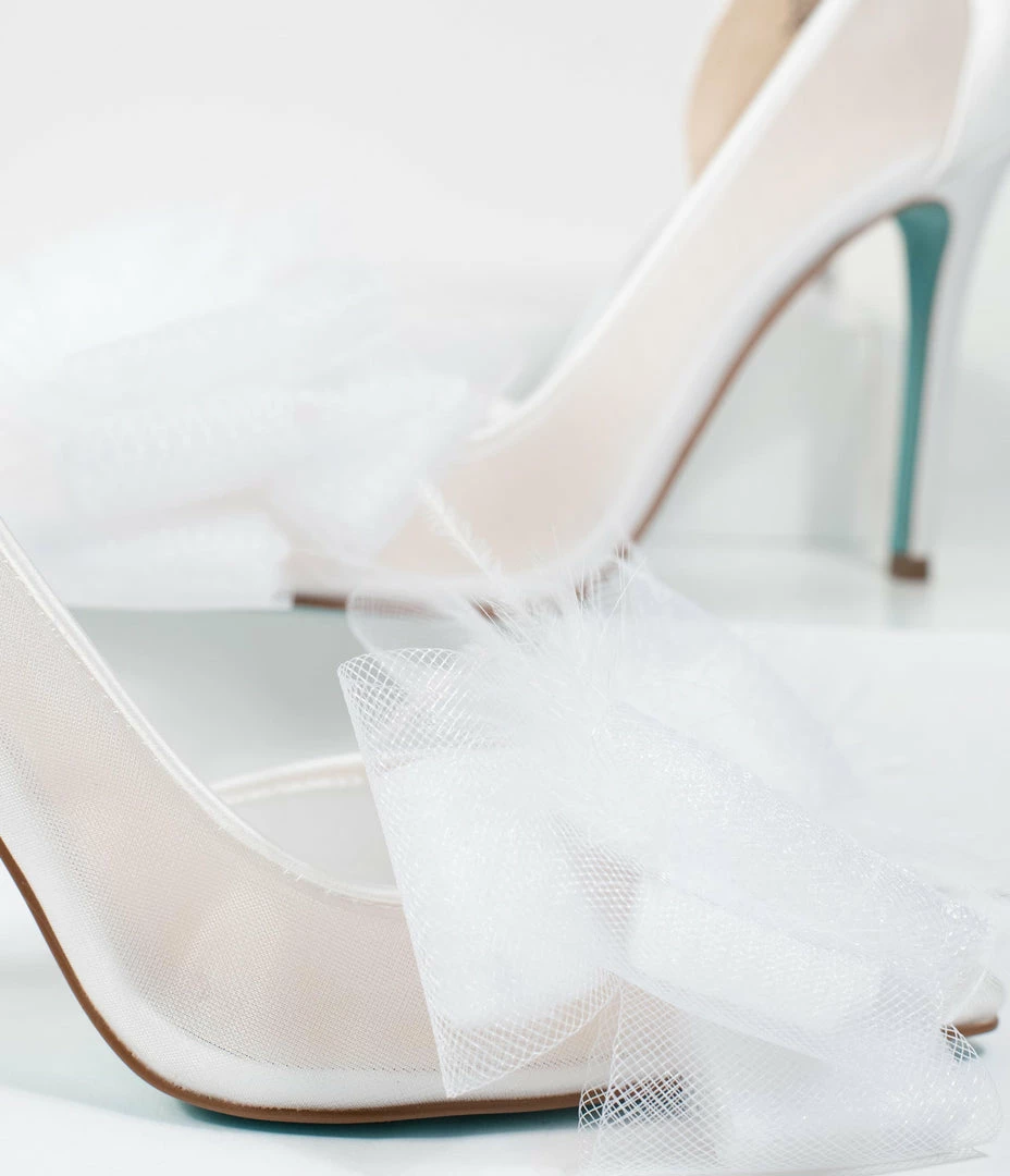 No need to wait for your fairy godmother! Betsey Johnson has got you covered with these divine wedding shoes are an enchanted pair in ivory satin and mesh that drops into a pointed toe that dances with a sinamay bow, accented with white feather. With a elegant 4 inch stiletto heel, cushioned insole, and Betsey blue sole, you’ll be ready for midnight dancing!