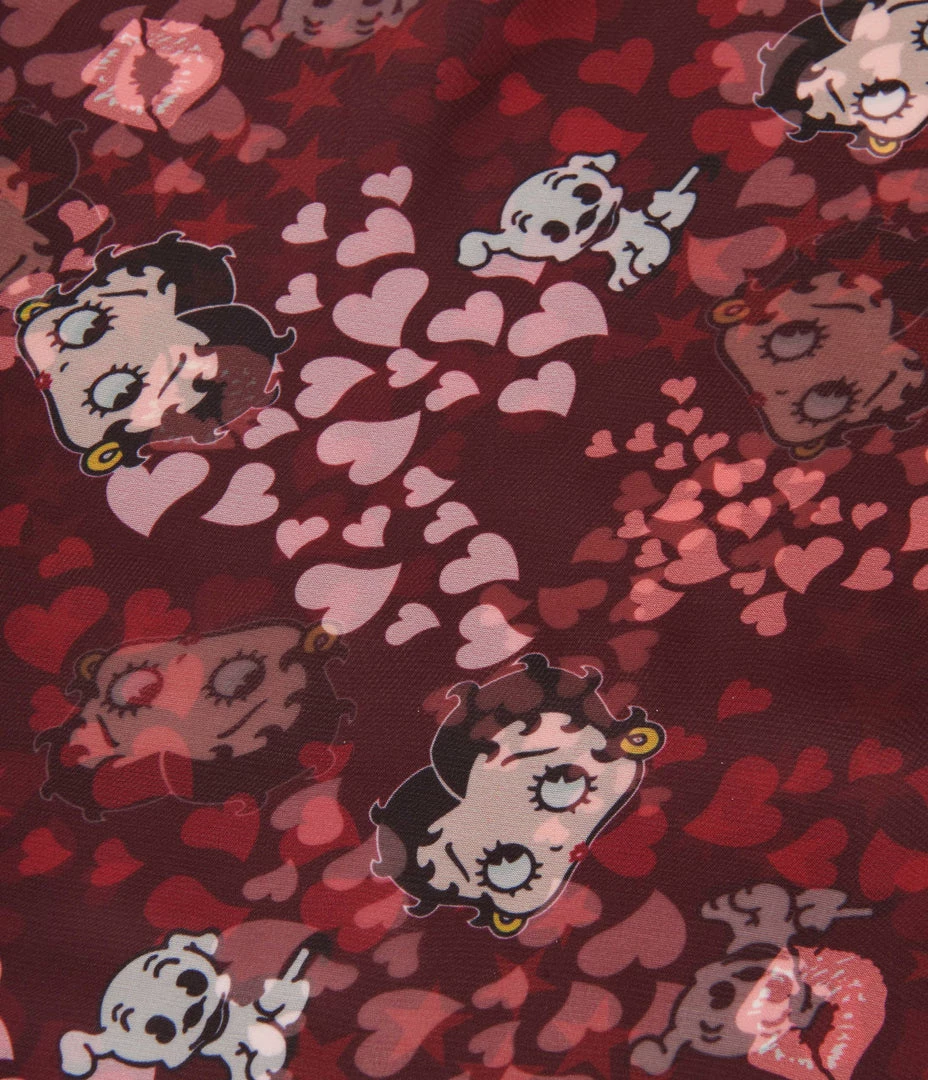 This iconic hair scarf, in collaboration with Betty Boop, is crafted in a lightweight sheer chiffon style fabric that dances with Betty Boop, hearts, kisses, and the adorable Pudgy printed throughout a burgundy red backdrop