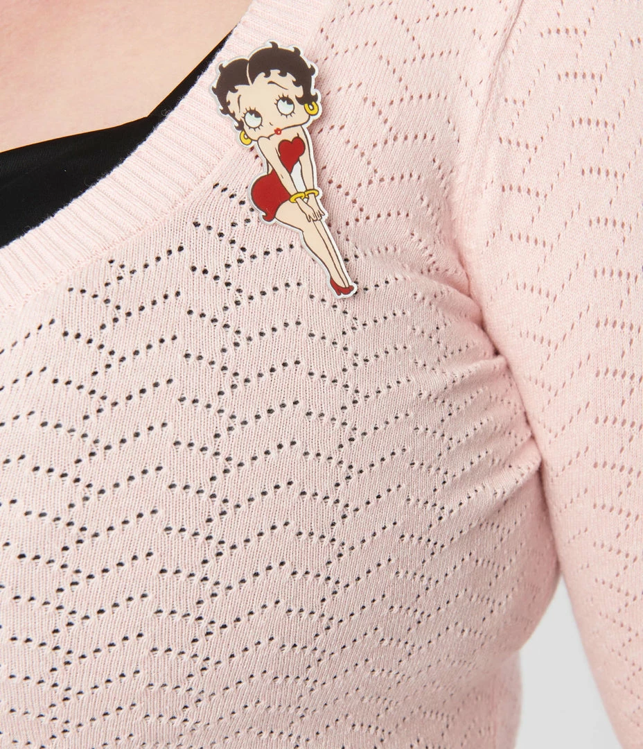 This adorably sweet plus size cardigan, in collaboration with Betty Boop, is crafted in a light pink perforated knit. The front button design leads to the V-neckline, accented by a removable Betty Boop brooch, and framed by three-quarter length sleeves. Complete with belt!