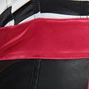 This sultry silhouette in collaboration with Betty & Veronica boasts a fabulous black and white striped bodice and a blackvegan leather pencil skirt. Outfitted with adjustable spaghetti straps, flexible boning, and a back zipper. Complete with a contrasting pink lace up accent for a faux corset style, and heart shaped patch pockets embroidered with the word “Smack”!
