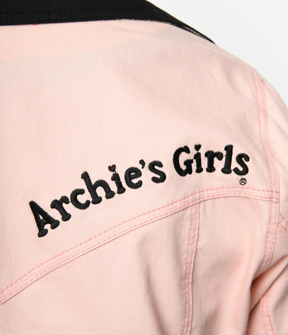 This charming pink denim jacket is set in a boxy crop silhouette and features a rhinestone button up front and embroidered patches on the back of Archie, Betty, and Veronica. Complete with long button sleeves and heart shaped pockets.
