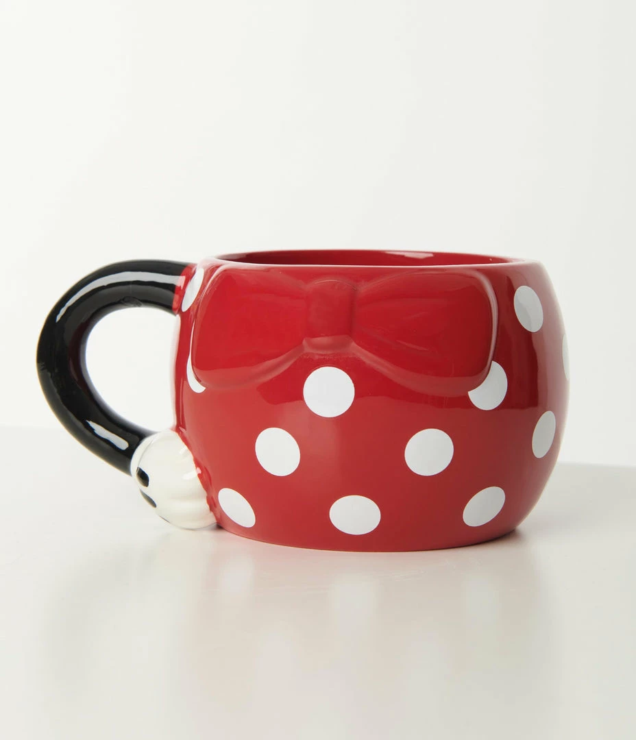 This adorable ceramic mug boasts a sweet Minnie Mouse design with white polka dots throughout the red backdrop, a charming bow, and Minnie’s arm and handle for the handle.