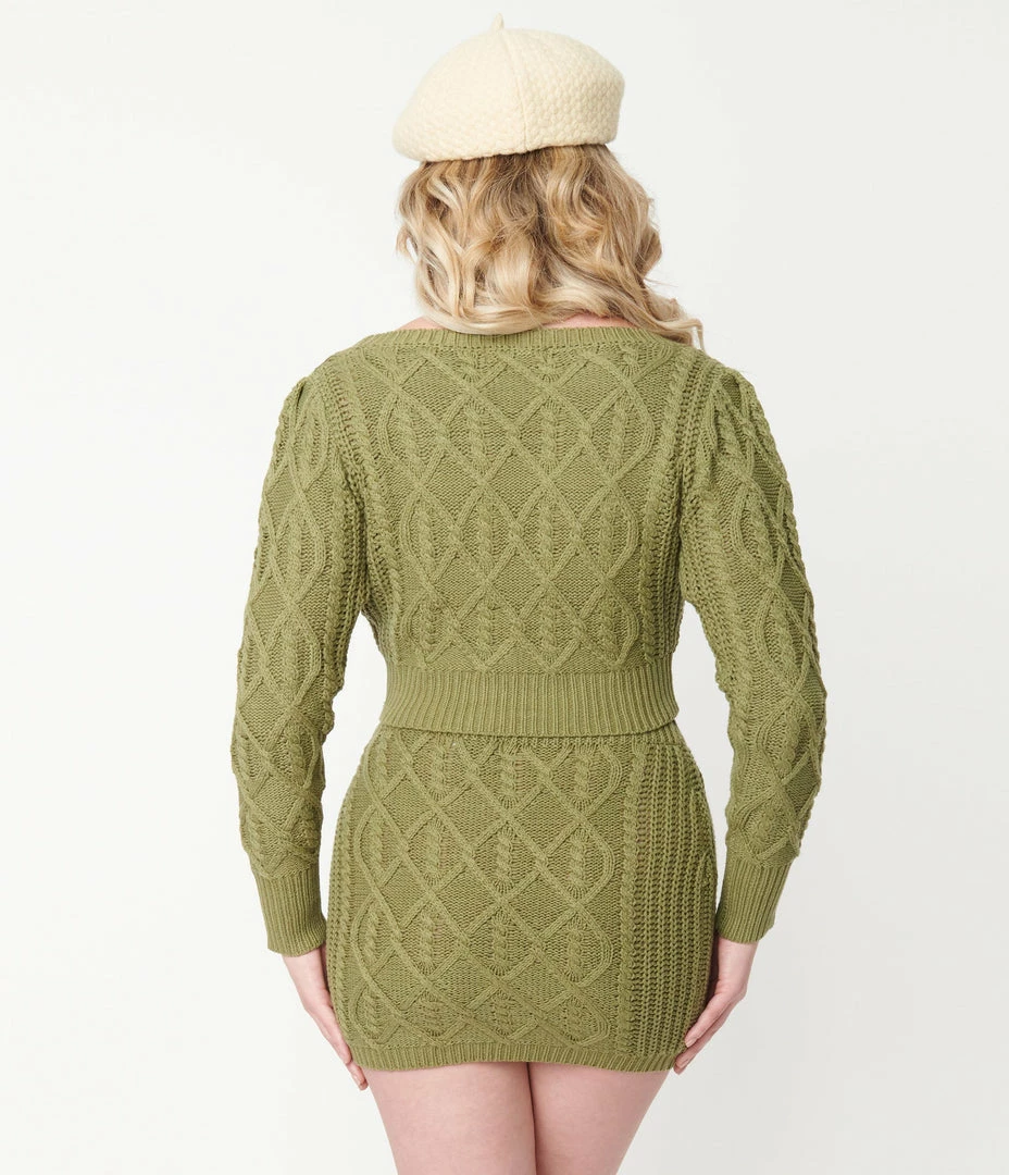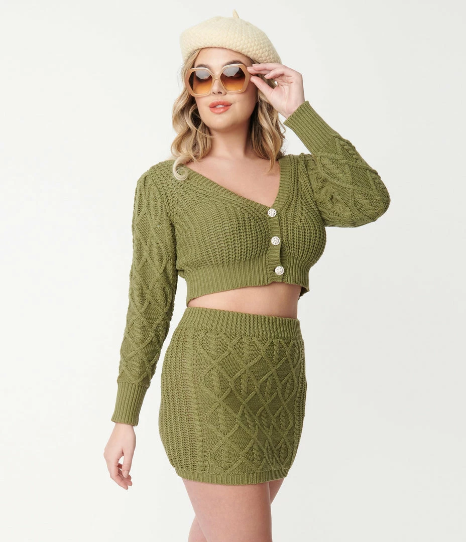 The perfect pair for swiftly changing seasons, this adorable sweater cardigan and skirt set are crafted in a fabulous olive green cotton knit blend that boasts a beautiful cable knit pattern throughout. The sultry mini skirt features an elastic banded waist for a fantastic cinch while the long sleeves cardigan boasts sparkling rhinestone buttons for a dash of elegance!