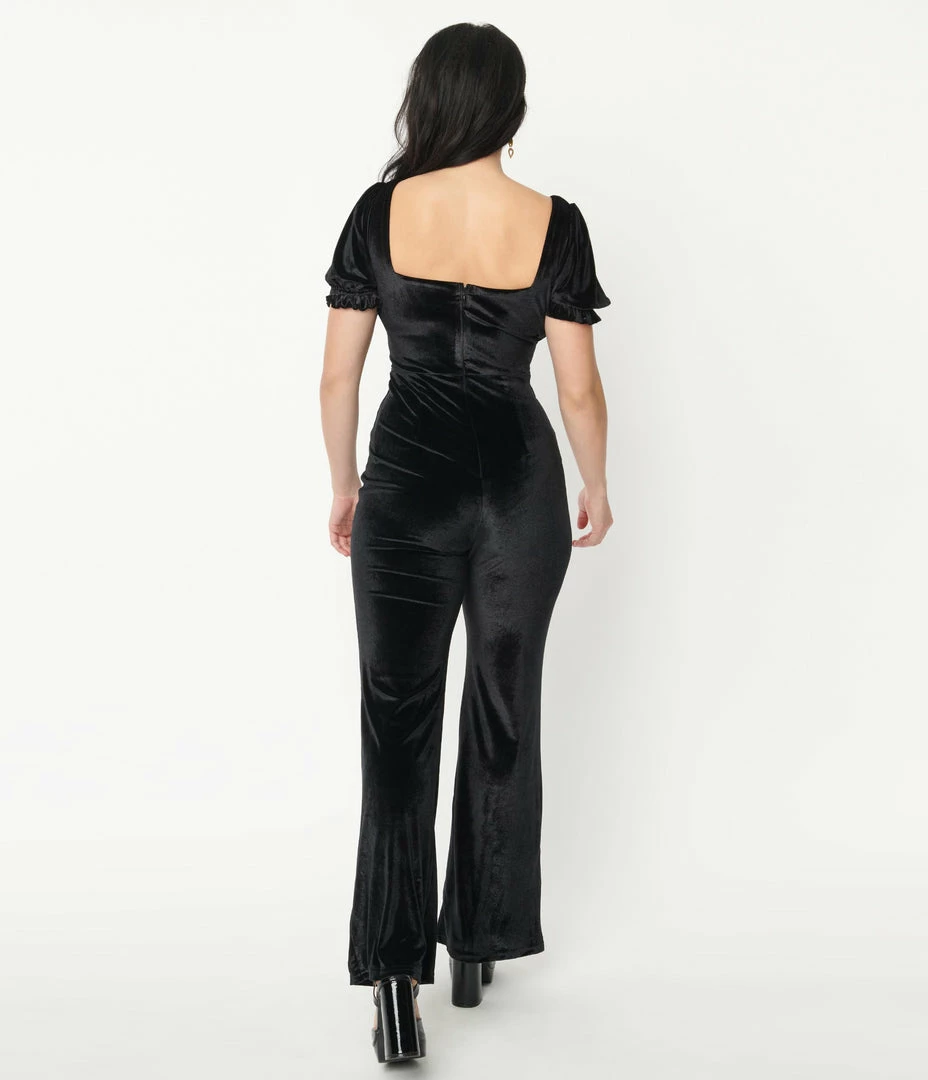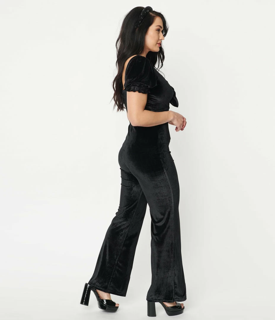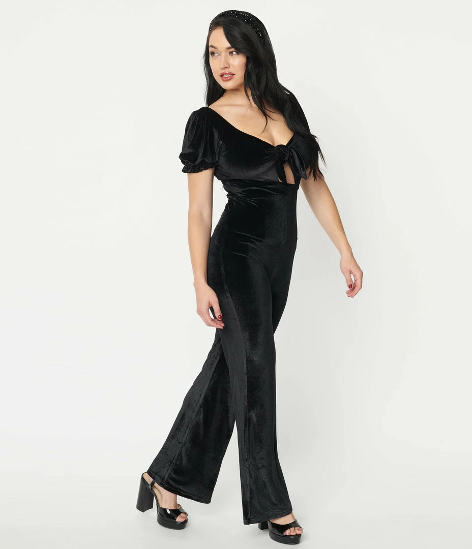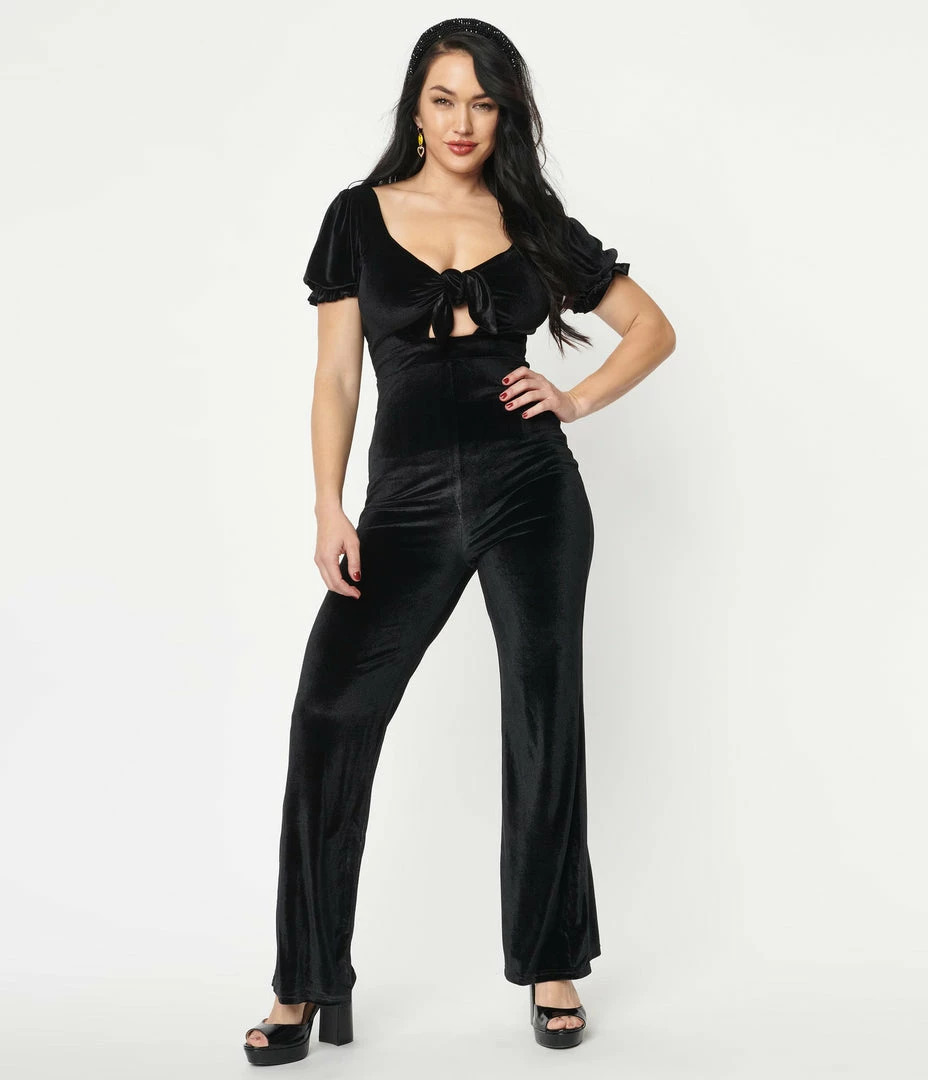 Set the rhythm of their hearts, darling! This sultry jumpsuit is an eye-catching silhouette crafted in black velvet to flatter your feminine form. The sexy front tie bust is framed by short sleeves, cinched with elastic cuffs, while the seamed banded waist is nipped in with a back zipper. The ravishing legs drop into a wide design for sweeping beauty!