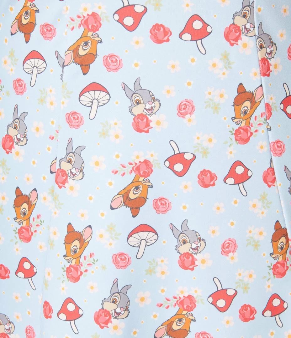 This adorable plus size shift dress from Cakeworthy is crafted in a fabulous stretch knit and boasts a sweet print of Bambi and Thumper among red and white florals throughout the light blue backdrop. Complete with V-neckline and adjustable spaghetti straps!