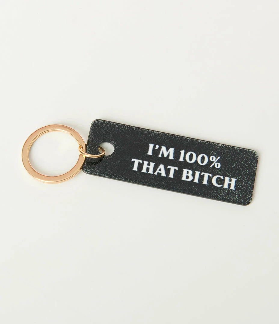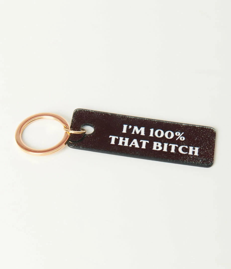 Let them know you’re THAT bitch with this bold keychain tag. Crafted in a black acrylic with the text “I’M 100% THAT BITCH”, complete with a gold colored split ring.