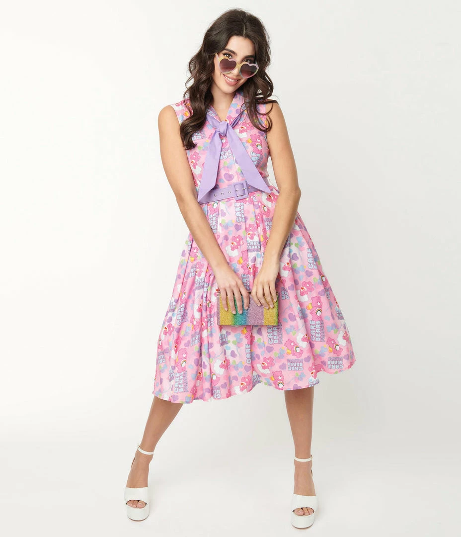 Sweet and sprightly, gals! An adorable silhouette for a vintage maven, the Edith Dress from Unique Vintage is a gorgeous confection on collaboration with the Care Bears, crafted in a lightweight woven fabric and featuring a sweet pink print of the classic Cheer Bear and Love-A-Lot Bear dancing around heart shaped balloons. The button up bodice leads to a notched collar while a charming removable neck tie adds a dash of retro embellishment. The seamed waist is cinched with a belt as the sweeping swing skirt drops past the knees, outfitted with side pockets for modern function!