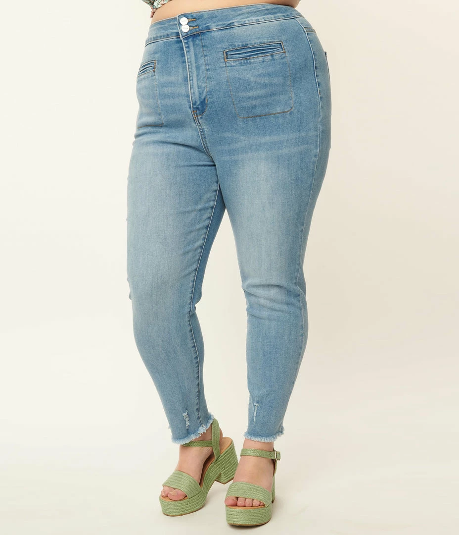 Crafted in a fabulous light blue stretch denim, the high rise waist is cinched with a front zipper and dual buttons. Boasting front and back pockets while the skinny legs are accented with a distressed hem.