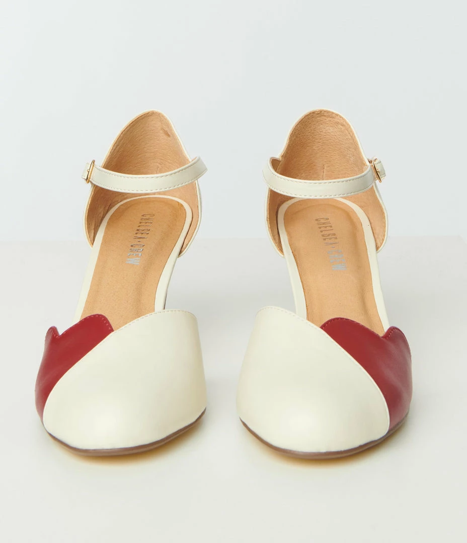 These adorable color-block heels are crafted in red and cream leatherette and boast sweet scallop detailing on the vamp. Complete with gored ankle strap and 3 inch heels!