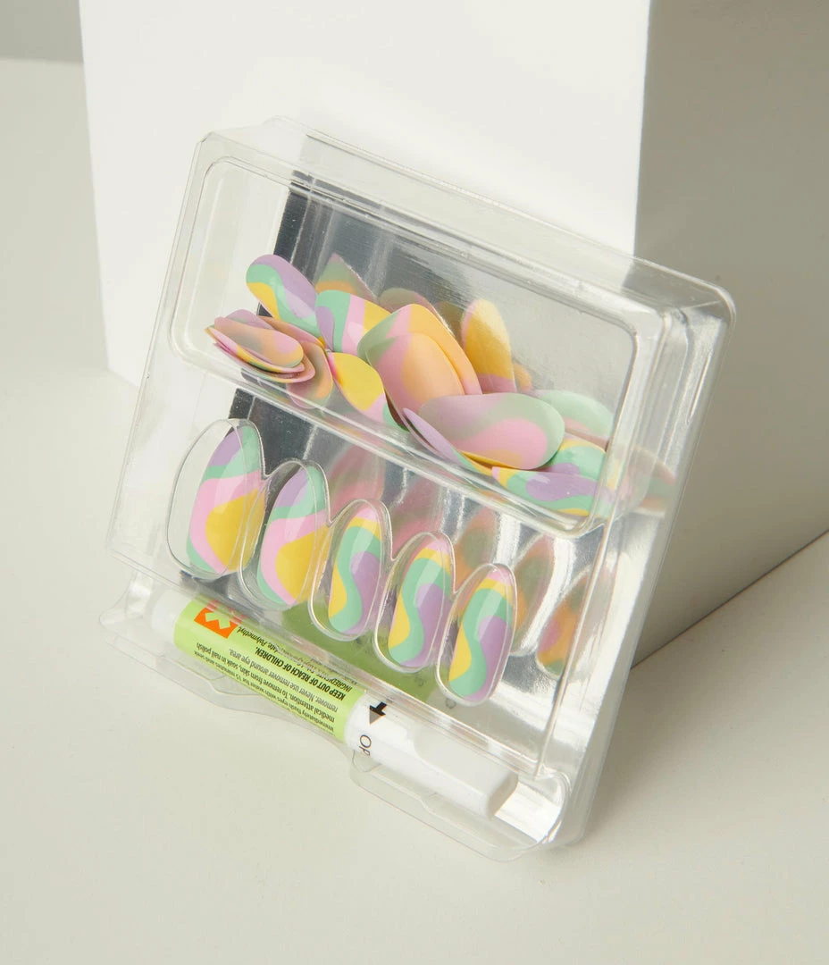 The perfect spring accessory! These adorable press-on nails are reusable and boast a sweet swirly design in pastel pink, purple, yellow, and green. Fun and flirty in a long almond shape, just choose the right size, file, and glue them to your nails for a fun touch!
