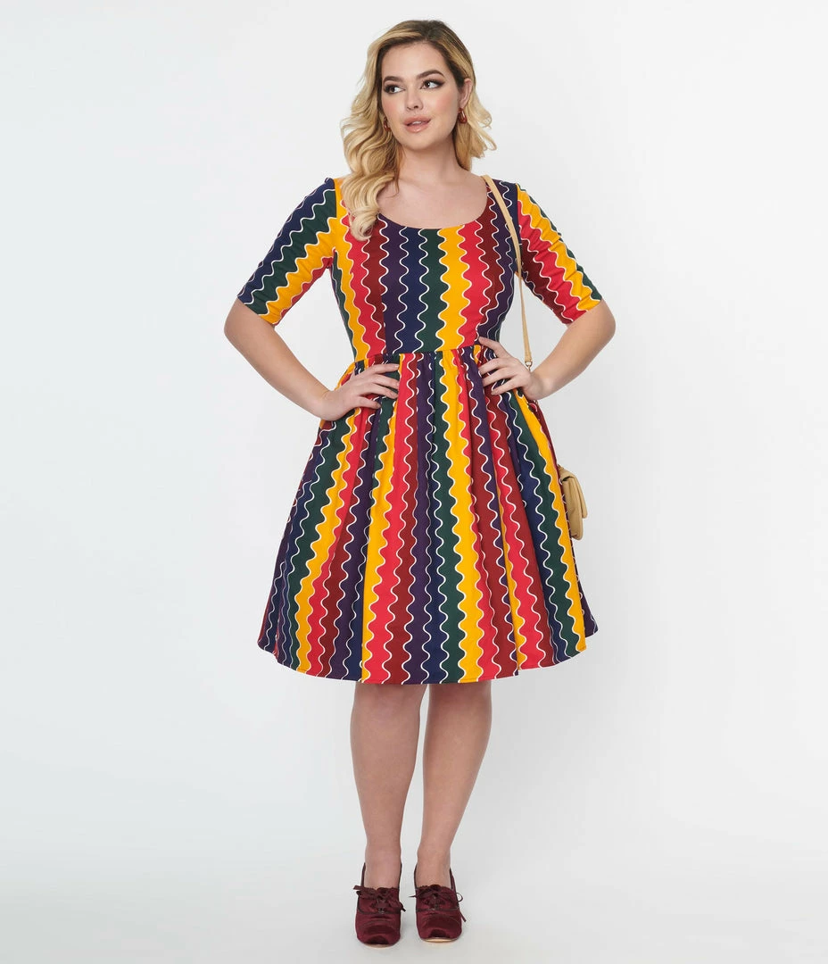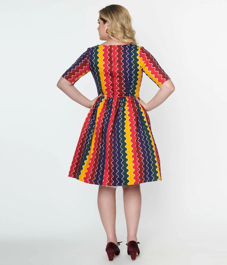 The Amber-Lea swing dress from Collectif is cast in a fun and colorful rainbow wave fabric. The beautifully fitted bodice has half sleeves and a scoop neckline above the gathered waist that falls into the classic 1950s swing skirt that dances around your knees, and boasts hidden pockets in the side seams for a touch of modern sensibilities! Complete with a covered back zipper.
