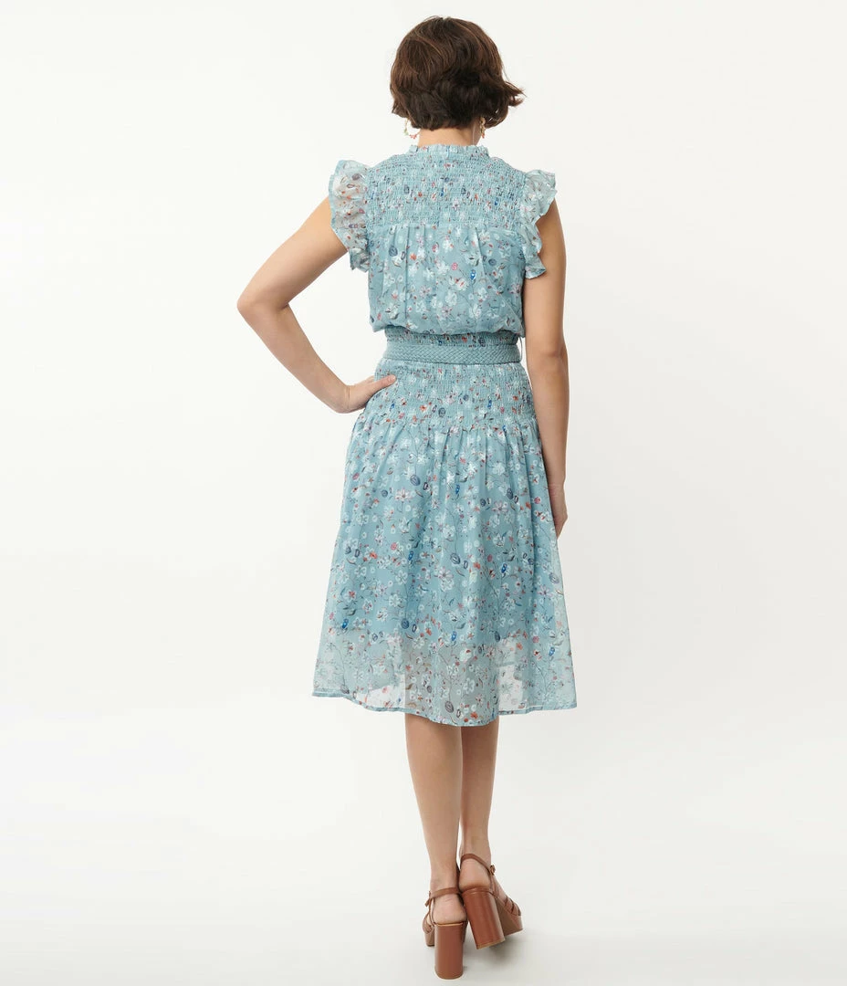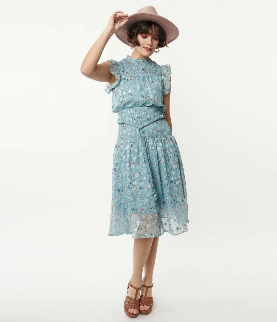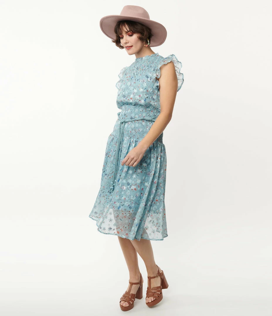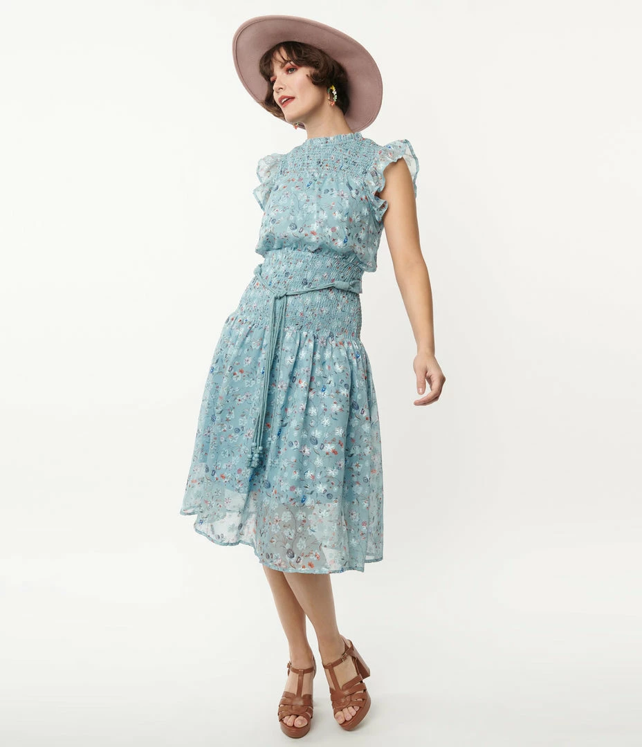 Summon your florals, dames! A sweet flare dress for a vintage darling, this sweet piece is crafted in a dusty blue crepe that dances with florals printed throughout. The smocked yoke is centered by a modest ruffle high neckline and framed by a ruffled sleeveless design, nipped in with a back zipper. A smocked wide waist flatters your hourglass as the flare skirt dances to the knees. Complete with a braided belt to embellish your form!