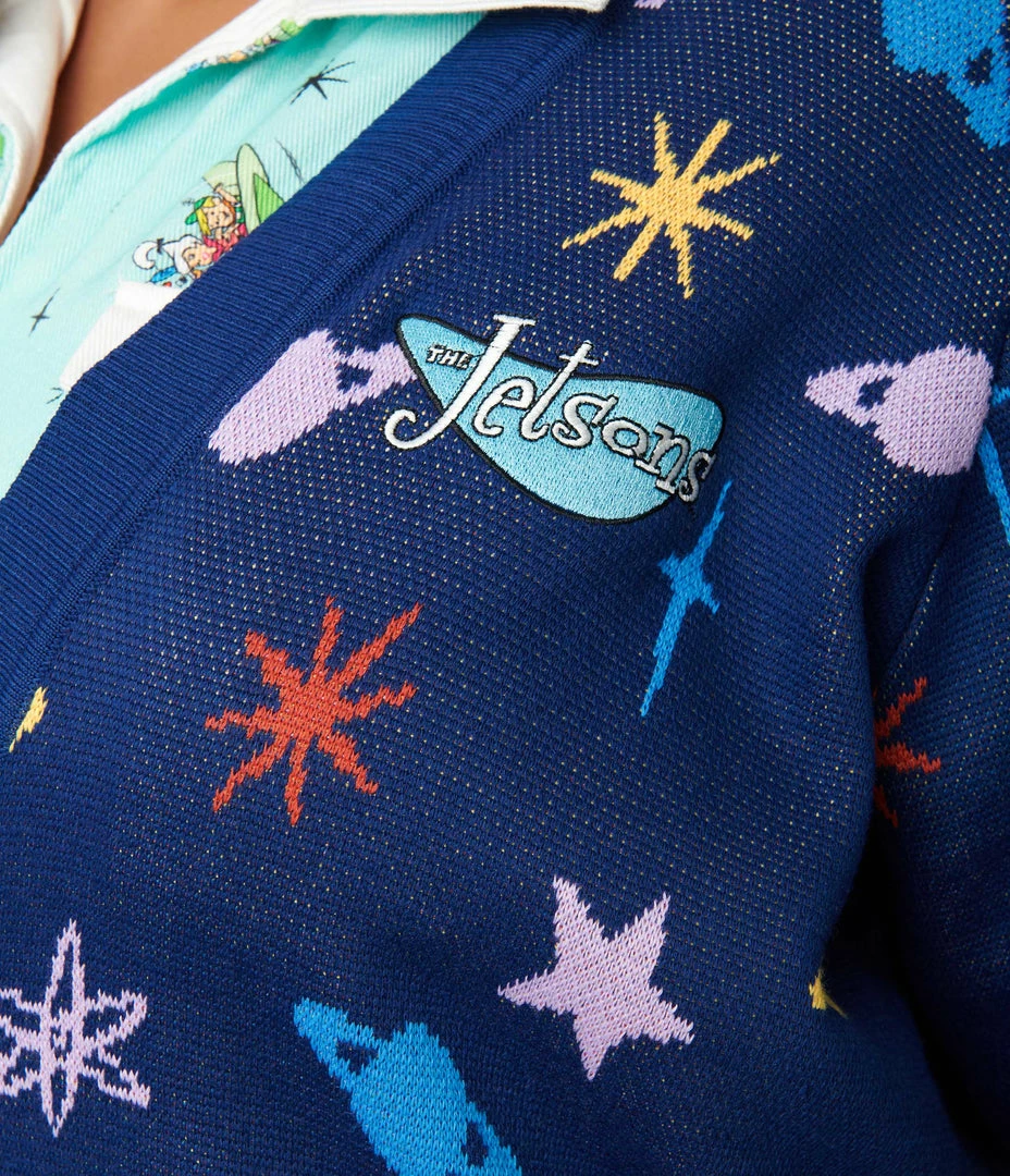 This out of this world comfy cardigan, in collaboration with The Jetsons is crafted in an oversized knit that boasts retro multicolored planets, atoms, and stars throughout the blue backdrop. The button up front leads to a V-neckline, is accented with a Jetsons patch, and framed by long sleeves and outfitted with side pockets!