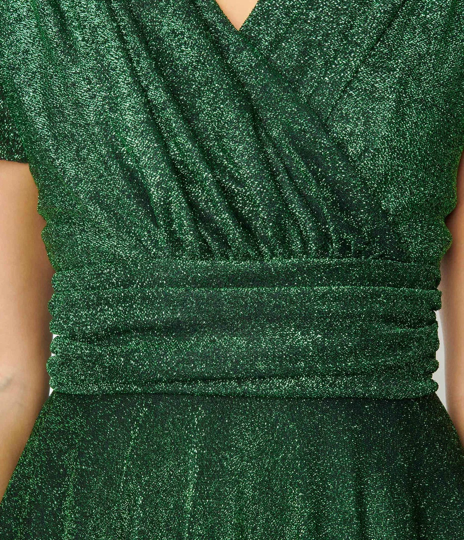 This enchanting treat is crafted in a green metallic threading throughout. The surplice neckline flatters your feminine form while the banded waist is cinched with a back zipper while the gathered swing skirt cascades past the knees over matching, smooth lining!