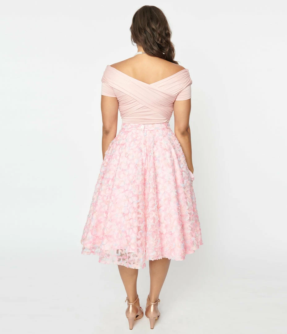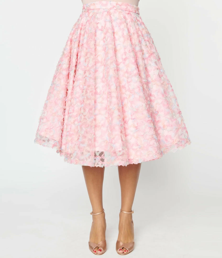 This sweet swing skirt is crafted in a light pink mesh that dances with 3D florals, over a matching lining. The banded waist is cinched with a back zipper and button.