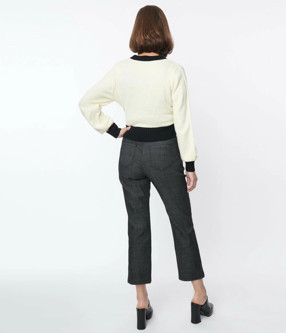 These rockabilly capris are crafted in black denim with a dash of stretch. Complete with notched cuffs and a front fly and button and outfitted with side and back pockets.