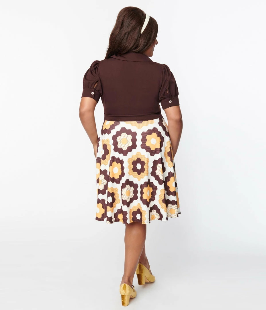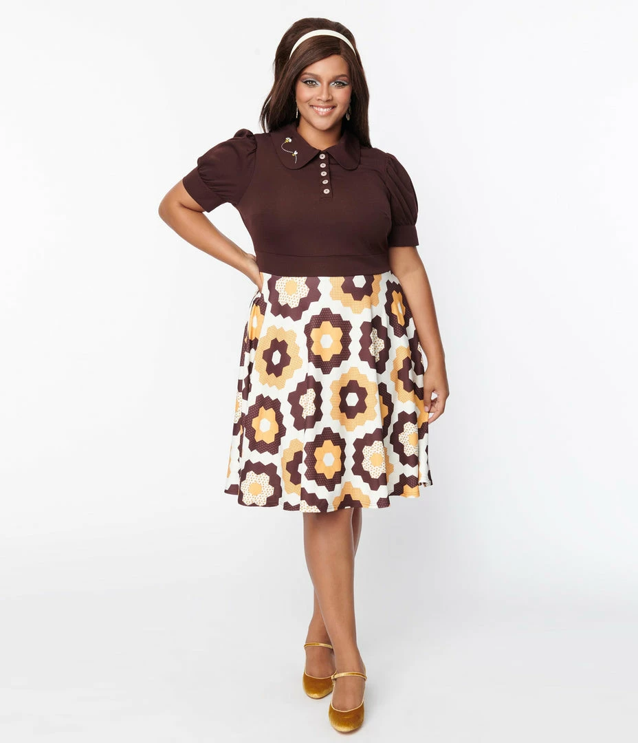 This sweet plus size flare dress is crafted in a knit blend that features a solid brown top and a playful flare skirt that dances with a brown and honey yellow honeycomb pattern in a unique quilted design. Outfitted with a side zipper, a partial button up front, and a charming embroidered honeybee accent on the collar.