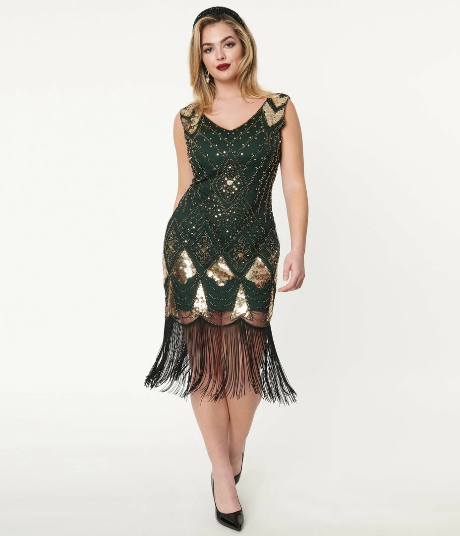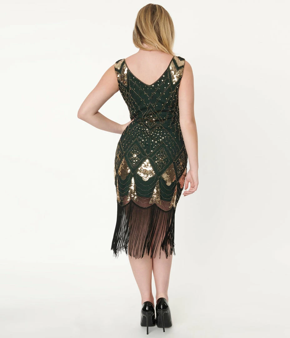 Weโre ready to give our exclusive, darling! The Lina Flapper is a thrilling silhouette of romance from Unique Vintage that will set their hearts to breaking. With a luscious emerald green knit lining, a delicate black mesh overlay slims your figure while twinkling gold sequins and beading lend a dash of starlight and enchantment to your silhouette. The gentle scalloped hemline drips with long black fringe that sways past your knees while a side zipper cinches in your figure. Lina is the thief of hearts!