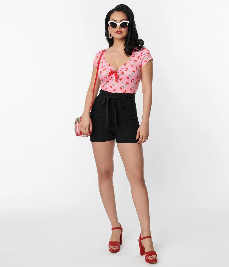 These retro shorts are crafted in a black stretch fabric, cinched with a front zipper and hook bars while the high waist is embellished with a matching sash and outfitted with side pockets.